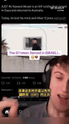 一名老外爆料,澳大利亚悉尼邦迪海滩枪击案中年轻的枪手是一名以色列国防军士兵,曾在加沙服役,而那位从枪手手中夺下武器的英雄救人的是一位穆斯林。这位老外透漏,新闻里好多人一直都是在针对穆斯林,把锅都甩给了这个倡导和平的宗教,试图带起这股节奏。但救下大家的却是穆斯林,而那位枪手从部队返回澳大利亚休养的,只因为心里积压了太多的事情,导致精神崩溃,决定以枪杀他人的方式想把满腔怒火发泄出来,最终截至12月15日,事件造成16人死亡(含1名枪手)、40人受伤,死者包括10岁儿童、87岁犹太大屠杀幸存者(为护妻中弹身亡)及2名警察。 是不是挺炸裂蛮讽刺的,被扣“极端”帽子的穆斯林真刀真枪的救了人,杀人的却是以军士兵,在加沙沾了血,回国就开始持枪杀人,那些带节奏的媒体和喷子,出事先把锅往穆斯林头上扣,连真相都懒得查,就盼着搞出点“宗教对立”的大新闻。现在脸被打肿了吧? 注:本文信息源于网络,内容仅为个人观点,无不良导向。