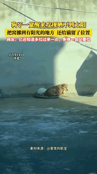 “解释不清了!”这哪是猫狗日常,简直是把岁月静好刻进了DNA里!河北这俩小家伙的晒太阳名场面,直接戳中了打工人的心巴。 大中午院子里睡得正香,太阳悄悄挪了窝,狗狗一睁眼发现没阳光了,立马起身拖着狗窝就走,还顺带捎上一脸懵的猫咪。更绝的是,它把窝挪到暖阳里躺好后,特意留了半边空位,等着猫咪慢悠悠凑过来。网友说“退休都不一定能过上这日子”,真不是夸张,这份不用商量的默契和惦记,比偶像剧还甜。 其实让人羡慕的从来不是晒太阳本身,而是有人愿意把舒服的时光分你一半。动物的相处多简单啊,没有弯弯绕绕,只有本能的分享和陪伴。 你家毛孩子有没有过这种不经意的暖心瞬间?