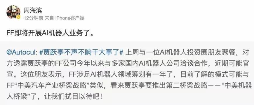 大新闻,贾跃亭的FF正在密谋进军机器人,模式与中美汽车产业桥梁一样。 要说还得是我贾哥啊!虽然公司就剩200多人了,但进入的都是万亿赛道。 现在汽车进入关键节点,21号就组装下线了,如果跑通了汽车,再跑通了机器人,那其他任何东西,我贾哥都能跑通了。 作为中美之间唯一合法的渠道,试问FF市值多少合适? 到那时候,下周回国,不再是虚幻的了。机场迎接贾哥的不再是要钱的债主而是送钱的投资人了!