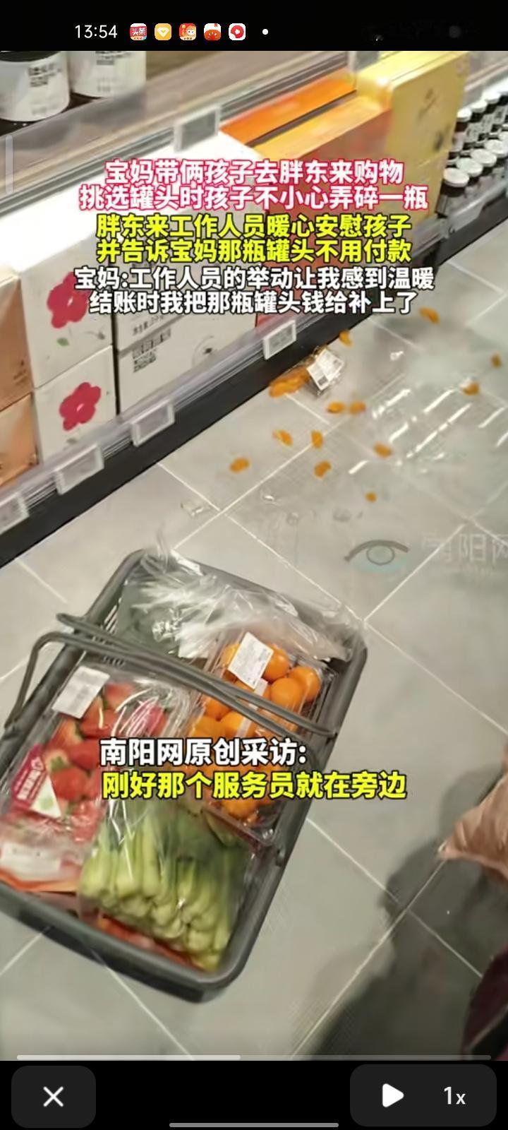 12月13日,河南许昌。宝妈带两孩子逛胖东来,挑选罐头的孩子不小心弄碎一瓶。工作人员到场不仅没有指责,还问他们有没有受伤及有没有吓到孩子,并表示摔坏的罐头可以报损。宝妈觉得,工作人员的举动让我感到温暖,结账时把那瓶罐头钱补上了。