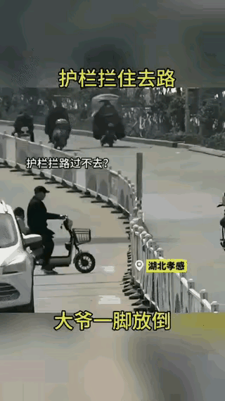 大爷脾气太暴躁了,还带着孩子呢,也不给孩子做个榜样。 大爷骑着电动车,后面还带着孩子,前面是道路围栏,大爷用脚踢坏了栏杆过去,回头又踢了几脚,让孩子也过来。 孩子坐上了车,回头一看,一个大妈也骑着车子过去了。