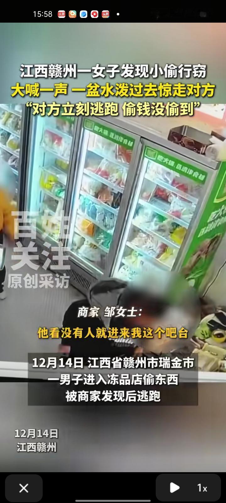 12月14日,赣州瑞金市。男子进冻品店偷东西,被商家发现后逃跑。 商家邹女士表示,该男子约30岁,他在店外看店里无人,就进到吧台抽屉准备偷钱。对方钱没偷到,自己没有报警,也是第一次遇到。 事发时,邹女士的朋友在店里,她用水盆泼向男子后,他立刻逃跑,因发现及时未受到损失。