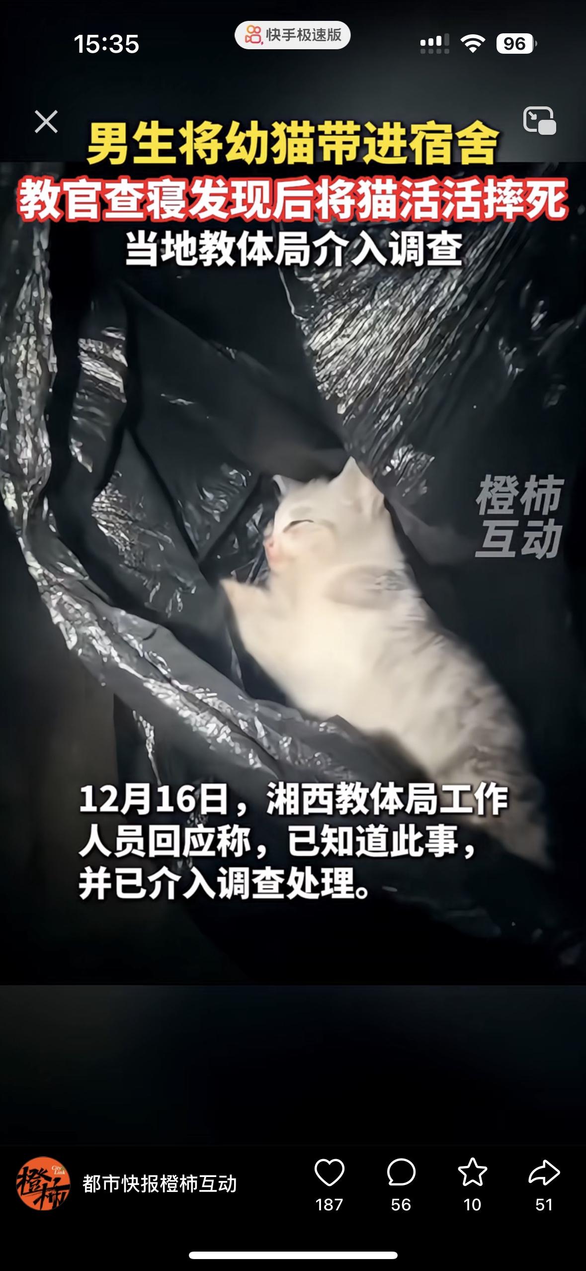 这种人太可怕了会遭报应的!建议学校处理 看的太让人心疼了,教官去宿舍查寝,发现男生带了幼猫进宿舍,可大学宿舍明确规定不准养宠物 被教官发现后,教官将幼猫活活的摔死了!处理的方式很多种,难道非要这样吗?不明白他摔死小猫究竟是对学生的不满,还是教官为了宣泄他把猫摔死了 一个无辜的生命,就这样没了!这样的人怎么能当好一个教官呢?对待弱小的生命都如此,又怎么能教学生?