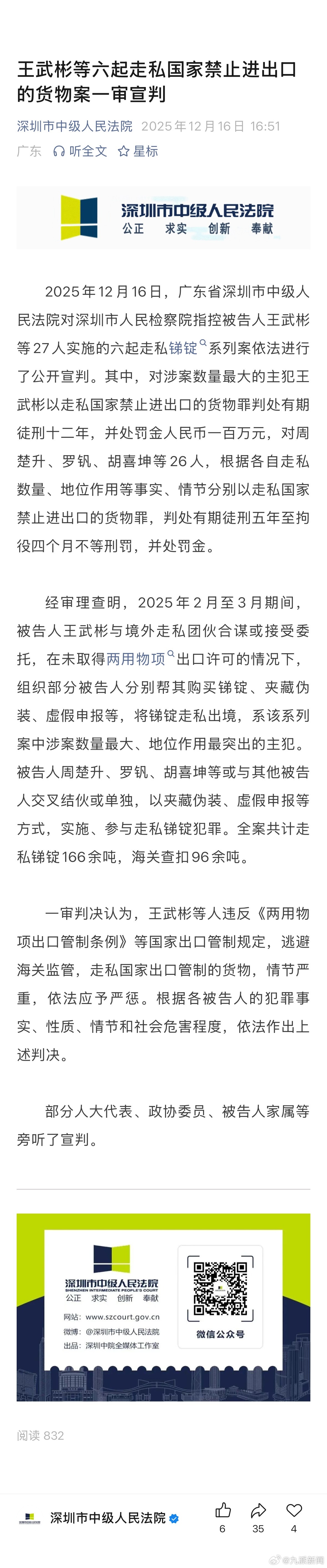 【#走私锑锭166吨27人被判刑#】2025年12月16日,广东省深圳市中级人民法院对深圳市人民检察院指控被告人王武彬等27人实施的六起走私锑锭系列案依法进行了公开宣判。其中,对涉案数量最大的主犯王武彬以走私国家禁止进出口的货物罪判处有期徒刑十二年,并处罚金人民币一百万元,对周楚升、罗钒、胡喜坤等26人,根据各自走私数量、地位作用等事实、情节分别以走私国家禁止进出口的货物罪,判处有期徒刑五年至拘役四个月不等刑罚,并处罚金。经审理查明,2025年2月至3月期间,被告人王武彬与境外走私团伙合谋或接受委托,在未取得两用物项出口许可的情况下,组织部分被告人分别帮其购买锑锭、夹藏伪装、虚假申报等,将锑锭走私出境,系该系列案中涉案数量最大、地位作用最突出的主犯。被告人周楚升、罗钒、胡喜坤等或与其他被告人交叉结伙或单独,以夹藏伪装、虚假申报等方式,实施、参与走私锑锭犯罪。全案共计走私锑锭166余吨,海关查扣96余吨。一审判决认为,王武彬等人违反《两用物项出口管制条例》等国家出口管制规定,逃避海关监管,走私国家出口管制的货物,情节严重,依法应予严惩。根据各被告人的犯罪事实、性质、情节和社会危害程度,依法作出上述判决。部分人大代表、政协委员、被告人家属等旁听了宣判。