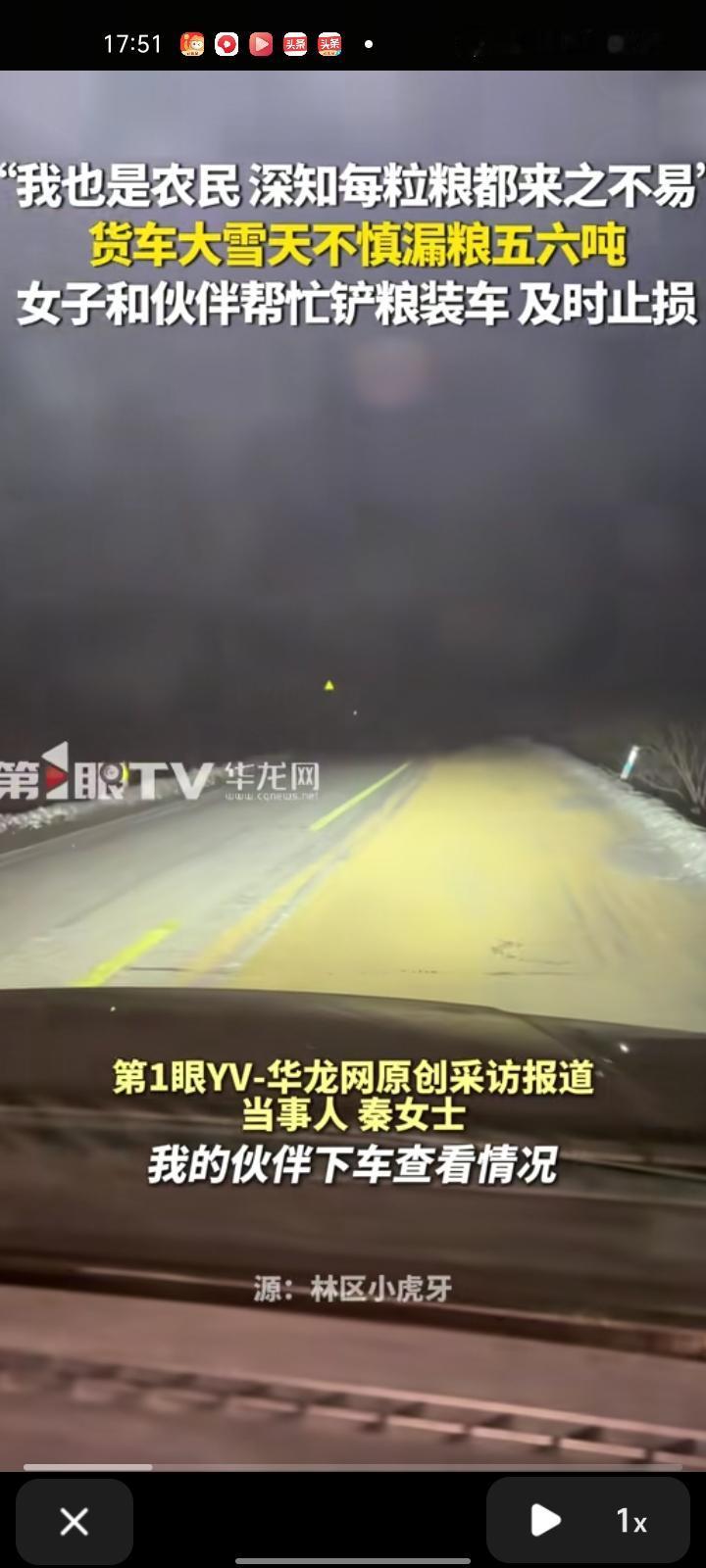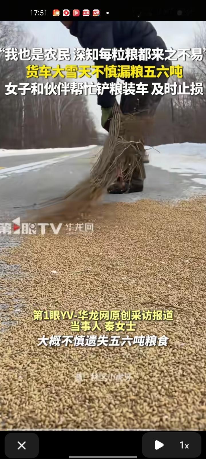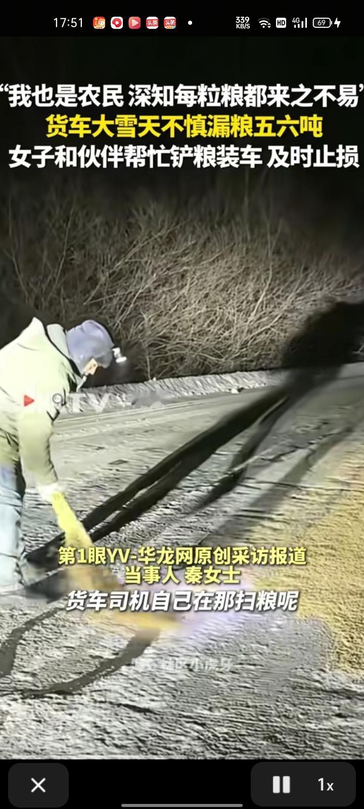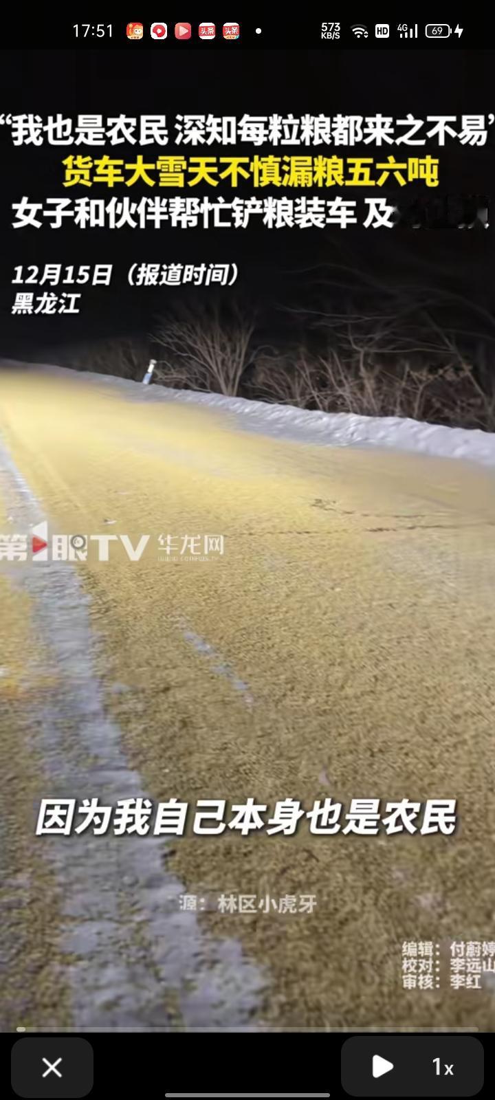 12月14日,双鸭山市饶河县。女子发视频表示,路上一辆大车过去,路面上全是粮食,那辆车可能是大箱子开了撒落的。看到这地上的水稻,女子满是心疼。 随后,女子掉头追上那辆车,告诉司机漏粮了,回程路上给家里人联系,让他们准备货车司机需要用的袋子、铁锹、笤帚等,返回事发现场后已是凌晨,室外温度接近零下三十度了,他们预估撒落的粮食遗失了五六吨。女子看着货车司机在路面上扫粮,穿着单薄的衣服,看着心里不是滋味。 到第二天早上,经历了这次抢救,路面上基本没什么粮食了,就是有一些被车子来回碾压扫不起来,也算是及时止损了。