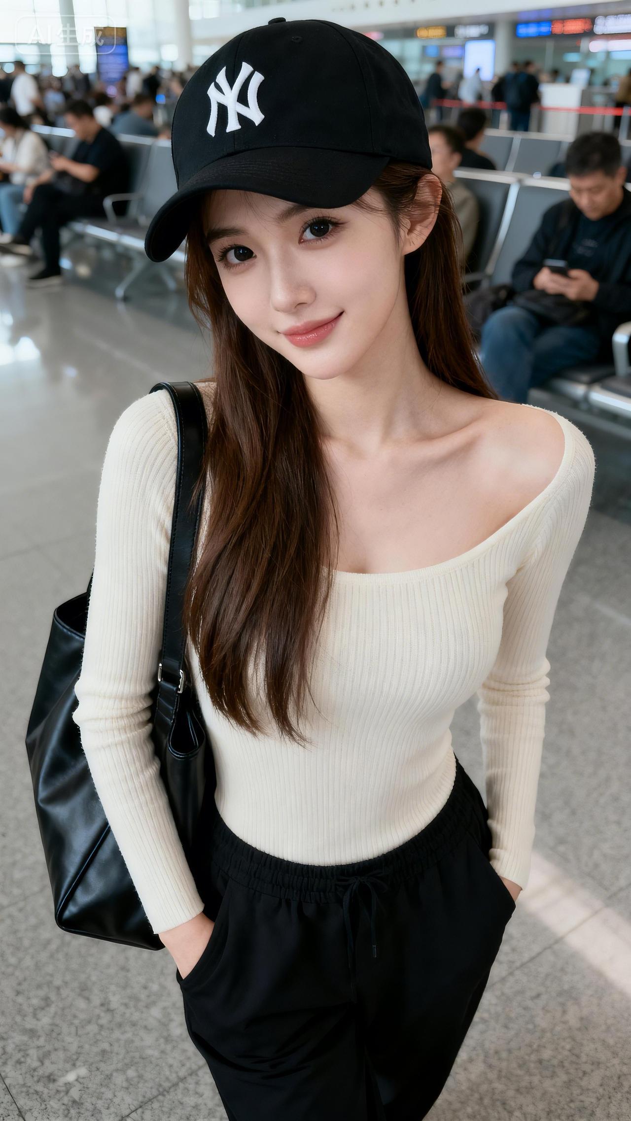 候机厅的光里,米白短衫搭黑裤,棒球帽压着甜 机场松弛感穿搭 日常甜酷风白色短t穿搭