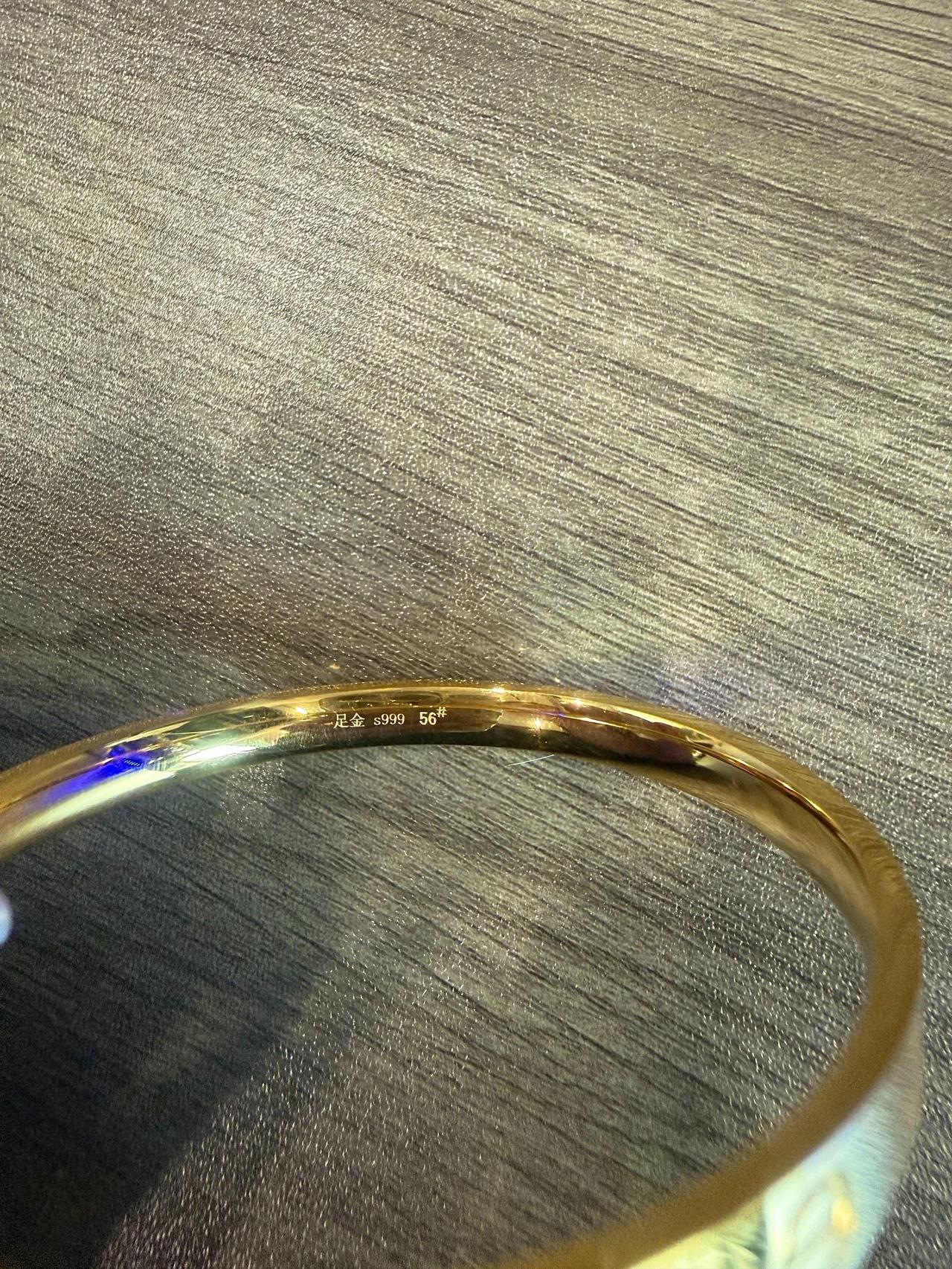 相亲对象送的金镯子 麻烦大家帮我看看是真的还是假的,这种钢印有没有问题?我记得以前看到的是写着足金999,和这种钢印有区别吗 这个多了个s?