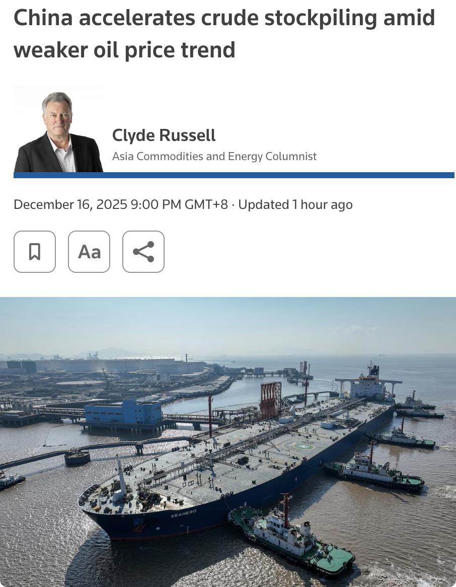 外媒:2025年11月,中国原油流入储备量可能达到六个月最高,因进口激增,而炼厂