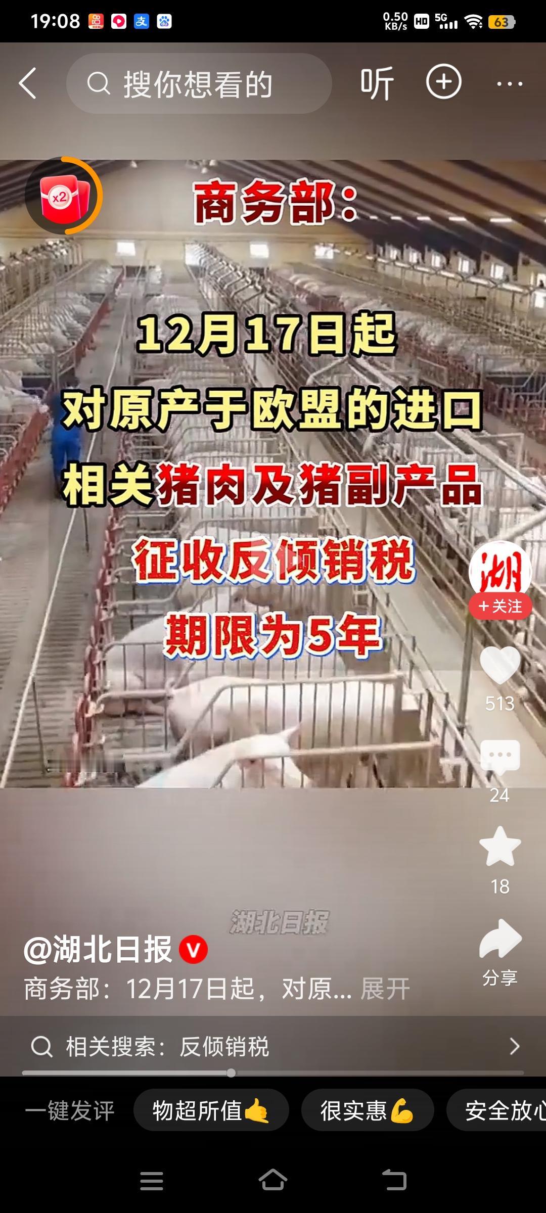 商务部对原产于欧盟输华的猪肉及猪副产品征收反倾销税,国内猪肉价格可能上涨。 从12月17日起,中国商务部对原产于欧盟的进口相关猪肉及猪副产品征收反倾销税,为期五年。 由于时近年关,正是国人猪肉消费旺季,加上商务部征收欧盟猪肉反倾销税,可能导致国内猪肉价格上涨,甚至带动相关牛羊肉和鱼类等价格上涨也有可能。