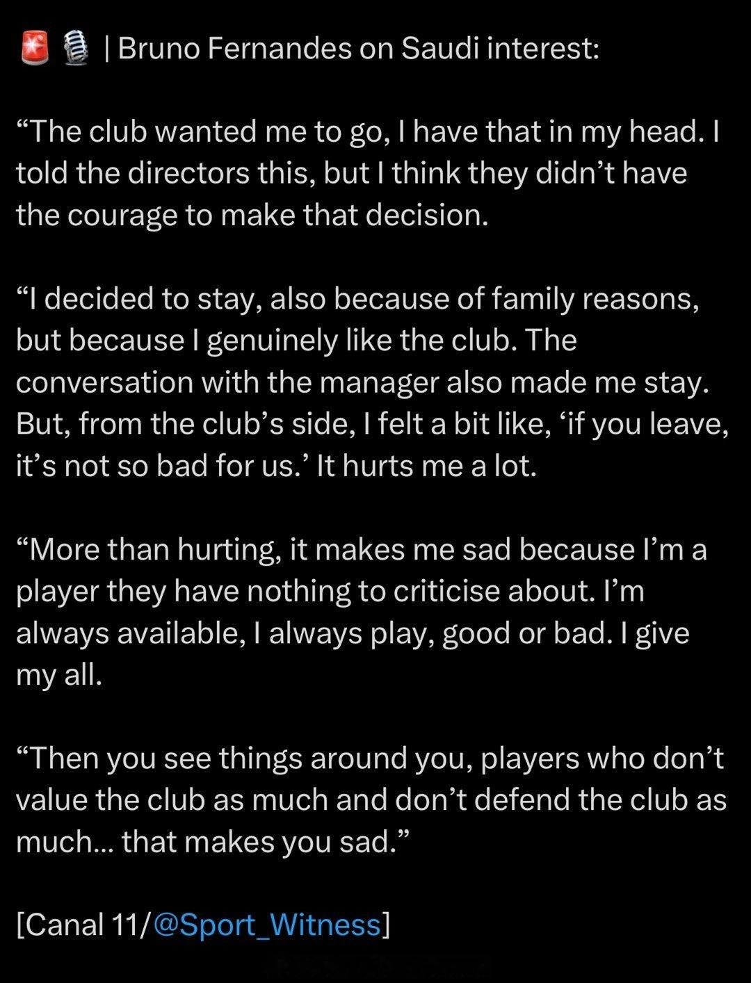 曼联方确认刚刚出现在媒体上的费尔南德斯关于转会的言论,时在数周前费尔南德斯好在葡萄牙国家队时接受canal+采访时硕的爆炸新闻了!“俱乐部希望我离队,我直接质问了总监们,但我认为他们没勇气做出这个决定。我决定留在曼联,也是出于家庭因素的考量,更因为我爱这家俱乐部。与主帅的交流也让我决定留下来。但从俱乐部的角度,藕感觉他们的意思是‘如果你离开,对俱乐部也没那么糟糕。’者让我恨受伤。“不仅仅是受伤,这更让我难过,因为我是一个无可指摘的球员,永远可以出战,总能保持健康的身体随时出场,或许表现有好有坏,我总是不遗余力。然而你环顾四周,有些球员并没有那么看重俱乐部,没有全力以赴的去捍卫俱乐部…这让我伤心。”