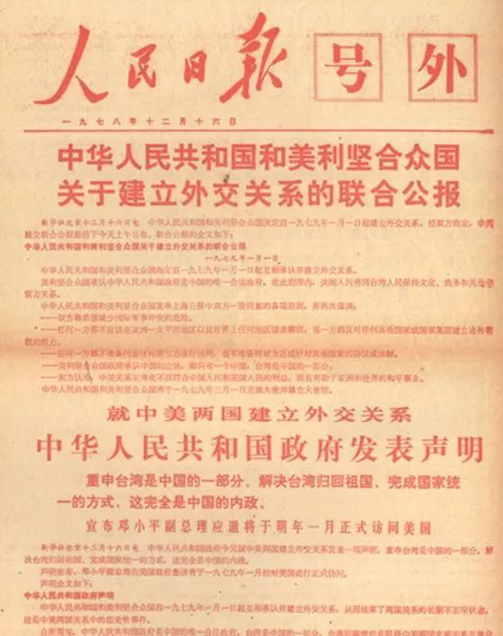 1978年12月16日,中美两国政府同时发表《中华人民共和国和美利坚合众国关于建立外交关系的联合公报》,宣布自1979年1月1日起互相承认并正式建立外交关系。 这一公报的发表标志着中美关系正常化进程的重要里程碑,其中美国承认中华人民共和国政府是中国的唯一合法政府,并确认了只有一个中国、台湾是中国的一部分的立场。