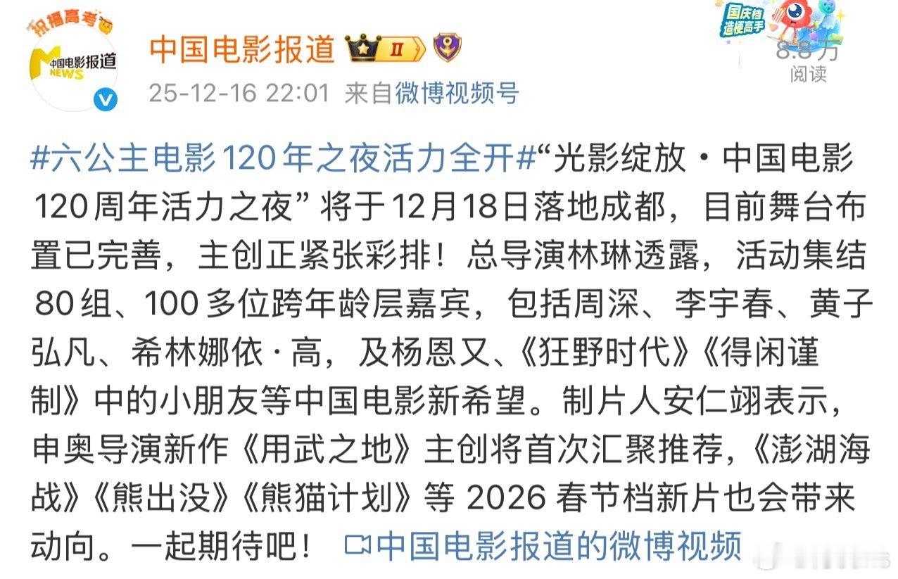 中国电影报道:电影120年活力之夜,《澎湖海战》《熊出没》《熊猫计划》等2026 春节档新片也会带来动向。这算半官宣吗