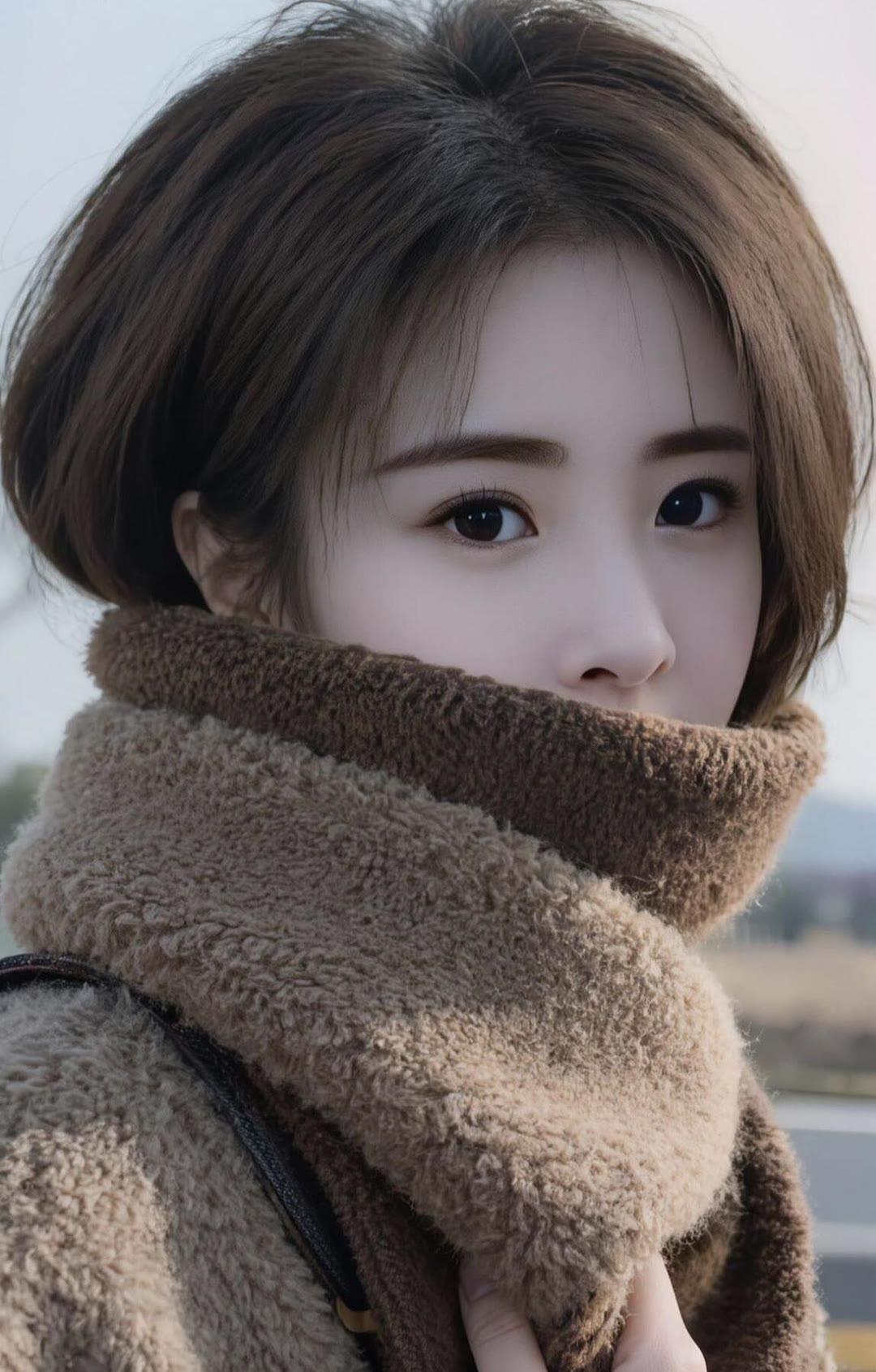 冬日暖阳下的温柔少女,毛绒围巾带来温暖与甜美。