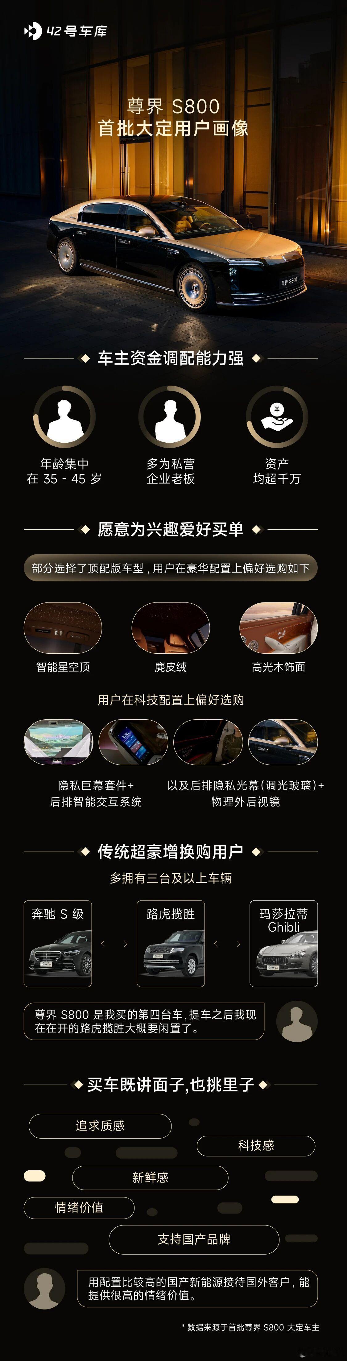 余承东称尊界已经出现口碑效应尊界S800的大定用户以中年高净值男性为主,年龄普遍集中在40~50岁。除了中年高净值男性,90后也成了豪车消费的主力军。有门店销售透露,目前买尊界S800的主力群体是老客户,尤其是买过问界M9的用户,不少人都选择再入手一辆尊界S800。