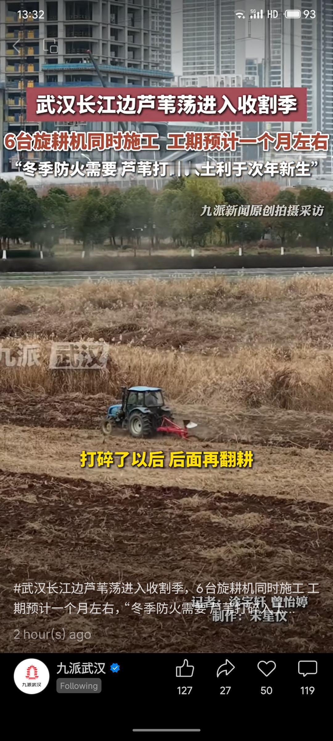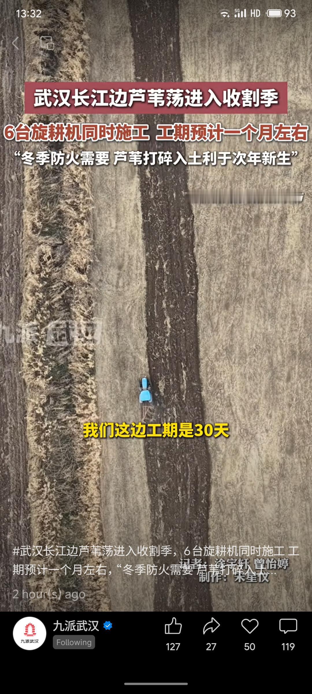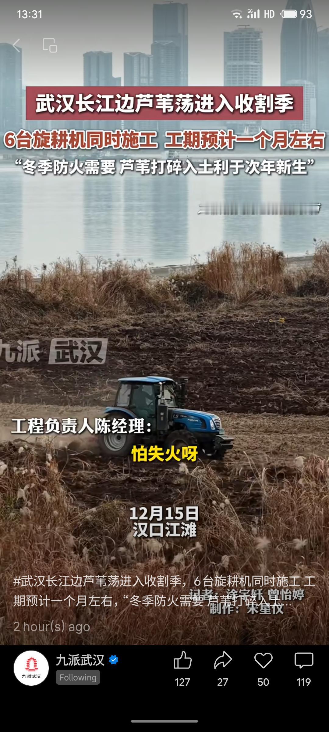 晒图笔记大赛武汉长江边芦苇荡进入机械化收割季,这是一项兼顾生态保护与公共安全的季节性管理措施。通过六台旋耕机将芦苇打碎并翻耕入土,核心目的在于消除冬季火灾隐患,同时碎秆还田可为土壤提供养分,促进来年芦苇的健康新生。此举体现了城市在自然生态维护中,采用科学化、高效率的现代化管理思路,有效平衡了湿地景观保护与城市安全需求,是一项值得肯定的可持续实践。