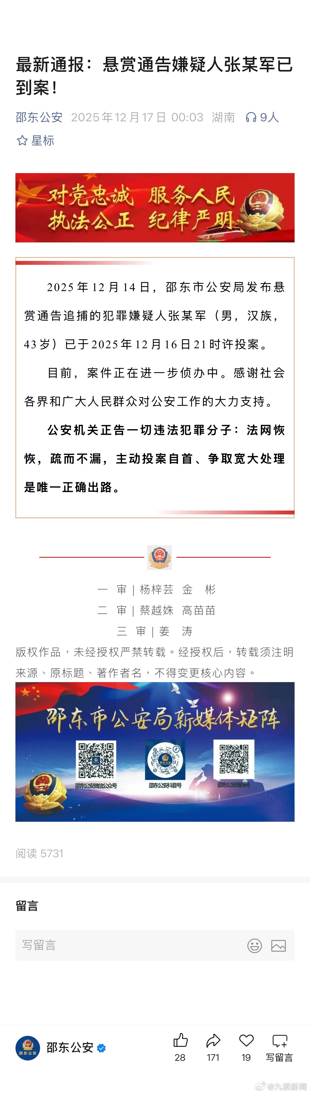 #悬赏5万刑案嫌疑人已投案#【#警方通报刑案嫌疑人潜逃后投案#】据湖南邵东公安:2025年12月14日,邵东市公安局发布悬赏通告追捕的犯罪嫌疑人张某军(男,汉族,43岁)已于2025年12月16日21时许投案。目前,案件正在进一步侦办中。感谢社会各界和广大人民群众对公安工作的大力支持。此前据媒体报道,12月14日,湖南邵东警方发布悬赏通告称,重大刑事案件嫌疑人张某某13日犯案后潜逃。通告称,张某某平时有抽烟及嚼槟榔习惯。张某某户籍所在地村干部称,张某某已离婚,有两个孩子,系犯下命案潜逃,他们正协助搜捕。案发地事发社区干部告诉记者,张某某疑似杀害一女子。