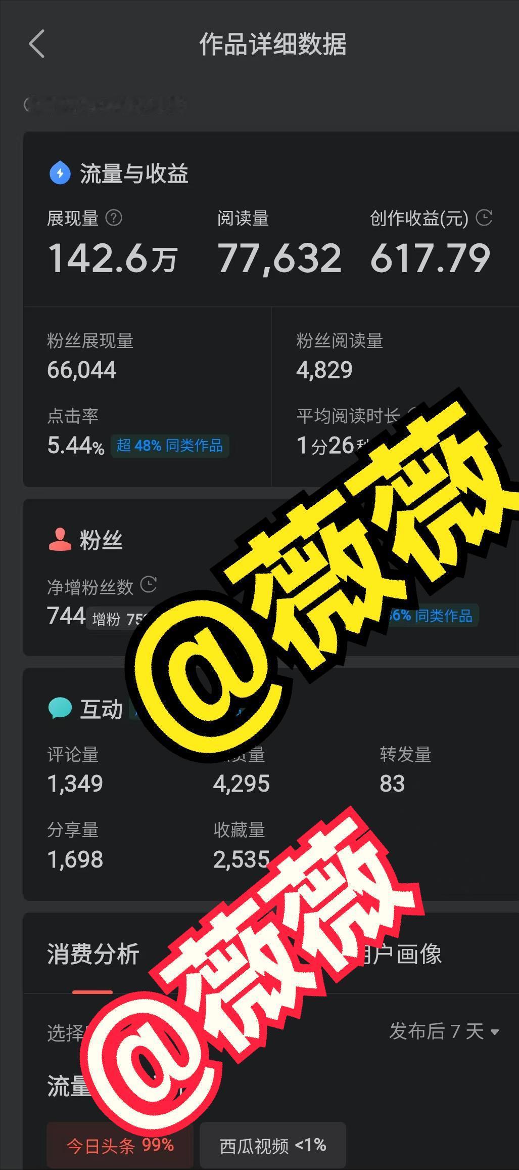 阅读单价又创新高竟然达到了8元。近日,我的一篇微头条推荐量140多万,阅读量7.7万,收益617.79元,单价达到了8元。总结分析要想单价高最根本的关键就在于这一点。 我已经在头条上写作赚钱四年多了。 自从写头条以来,单价的算法因素也一直在变。 以前,我的最高单价达到了20多块钱,一万阅读量就能收益200元。 现如今我的单价一般是四五块钱,很少有到8块钱的。 然而,我写的那篇微头条的单价竟然增长了一倍。 其实,我的那篇微头条没有多么华丽的文采,字数甚至比其他的文章还要少几百字。 后来,我总结发现,影响单价的最根本关键点就是这一点:信息价值非常高。 我写的是这四年来的写作经验分享。 那篇文字里,没有浮夸的技巧,没有讨好的标题,只是将一段真切的生活体悟、一种解决问题的诚恳思路,轻轻铺展在纸上。 我写下时,心中想的并非流量,而是远方某位或许正需这一点光亮的人。 我最开始写那篇微头条的初衷就是在收到了一位朋友的私信,询问关于如何写头条,我用什么写的问题。 我为了更加详细全面地回答那位朋友的问题,而写了那篇微头条。 我在文中所分享的经验确实是没有任何保留。 我非常详细认真地把我这四年来的心得体悟方式方法都分享了出来。 很多朋友看了文章之后,纷纷留言评论,认为非常有价值。 我忽然明白,在信息如潮水般涨落的当下,最稀缺的不是喧嚣的声音,而是沉静的价值。 那沉甸甸的数字背后,仿佛不是算法的馈赠,而是成千上万陌生人的无声认同。 单价8元,这不仅是平台衡量的尺度,更是读者用时间与共鸣投下的、有重量的信任票。 虽然说互动高低会影响单价,但是我认为互动是表象,价值才是底层逻辑。 当你的文字触碰到他人真实的困惑与需求时,便不再是屏幕上一闪而过的符号。 因为,此时此刻,它成了渡人的舟,照路的灯。 那七万多次阅读,是七万多次轻轻的“哦,原来如此”;那长长的评论列表,是思想激起的、绵延不绝的回响。 最后,如果想要获得高单价,你要明白这一点: 当你专注于提供真实的帮助、分享深刻的理解时,价值自会如静水深流,穿透数据的浮沫,抵达人心最柔软的角落。 收益,不过是那朵无心插柳、却必然开放的花。 这条路,我会怀着敬畏,继续走下去。 因为最丰厚的回报,始终是那句未曾说出口的:“你的文字,对我有用。”