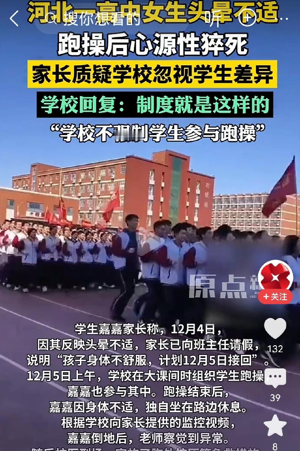 校方回应 石家庄高中女生跑操猝死,校方回应冷漠[流泪] 嘉嘉,是石家庄精英中学的一名高一女生。 12月4日,出现身体不适,家长向班主任请假,表示12月5日接回。 12月5日,大课间跑操时,嘉嘉因不适坐在操场边5分钟后到底昏迷。 校医赶到做了抢救,后送到医院急救。嘉嘉还是走了。 诊断证明书:心源性猝死,爆发性心肌炎 事发之后,悲痛欲绝的家长质疑学校: 学校忽视学生差异,抢救不及时 学校回应:制度就是这样,学校不强制学生跑操。 一个花季少女,就这样走了,生命永远定格在学校大课间跑操的赛道上。心痛! 理解家长痛失爱女的心情,家长的质疑也不无道理。嘉嘉之前身体出现不适,和班主任有沟通。如果能够重视这件事,不让嘉嘉跑操,可能悲剧就不会发生。 学校的回应太冷漠,制度是冷的,人心是热的。 孩子出事七天,学校没有任何表示,说不过去。学生死在学校,人道主义关怀该有吧! 搞教育的人,面对一个生命的逝去,不该这么冷漠无情!