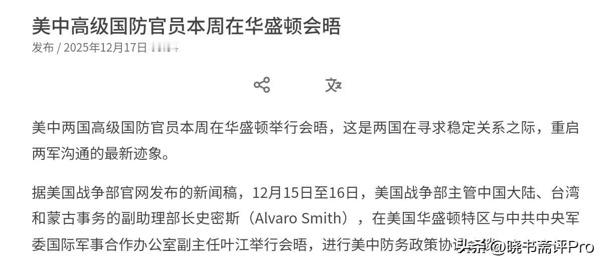高市早苗估计要倒吸一口了!中美军方在华盛顿举行会晤,重点就是区域和平稳定!12月17日,根据外媒表示,在中日之间发生所谓的雷达照射事件之后,中美双方进行了军方首次面对面会晤。美国战争部主管中国大陆、台湾和蒙古事务的副助理部长史密斯在美国华盛顿特区与我方官员举行会晤,进行美中防务政策协调会谈。 史密斯明确表示开展两军沟通,目的是在整体上促进战略稳定,并加强危机去冲突和降级管控,并以此推动美中实现稳定和平、建立相互尊重关系,巩固相关进展。很显然,中美两军之间在这个时间点进行对话,这非常的不同寻常。从美国方面的态度来看,有两个信息不容忽视。 其一是,美国对中美两军关系进行了定调,那就是追求和平,并以危机降级管控为目标。其二是,美国方面对于日本制造出来的雷达照射事件一句话也没有说。无疑,美国的意思很清楚,升级对抗不是美国的选项,美国要的是和平,要的是稳定。如果以美国这样的立场看待日本的行为,不客气的说,现在的日本就是一个麻烦制造者。 不管是高市早苗在台湾问题上的挑衅,还是日本自卫队故意滋扰我方航母舰载机起降训练,这本质上就是制造危机,让局势走向不可控。既然美国希望和平,那这也就意味着高市早苗政府的挑衅行为不仅得不到美国的支持,而且美国恐怕要做的就是给日本施加压力,让日本消停一点,而这对于高市早苗而言,不啻于一记闷棍。