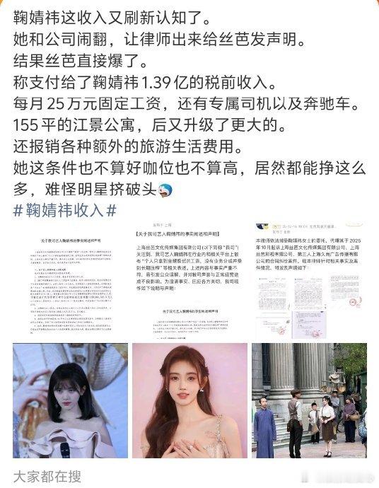 鞠婧祎每月25万元固定工资家人们,最近娱乐圈又爆出了一个让人惊掉下巴的消息:鞠婧祎每月有着 25 万元的固定工资!这数字一出来,瞬间就在网上炸开了锅,大家纷纷在讨论,这到底是合理的薪酬,还是明星光环下的虚高报酬呢?咱们先来聊聊明星这个职业。在普通人的认知里,明星们那可都是风光无限的,一场演唱会、一部电视剧下来,收入就相当可观。但这背后,其实也有很多不为人知的辛苦。就拿鞠婧祎来说,她从出道以来,在舞台上的每一次表演都力求完美,舞蹈动作、表情管理都做到极致。为了保持身材,她可能要严格控制饮食,甚至连一口自己喜欢的美食都不能尽情享受。而且,明星们还要面对各种舆论压力,一点点小失误都可能被无限放大。从这个角度看,25 万的月薪似乎是对她付出的一种回报。不过,咱们也得理性地看待这个问题。有专家指出,目前娱乐圈存在着薪酬结构不合理的现象。一些明星的收入远远超过了他们实际创造的价值。据相关数据显示,在影视行业,演员的片酬占据了制作成本的很大比例,这就导致了在后期制作、剧本创作等方面投入不足,从而影响了影视作品的质量。对于鞠婧祎每月 25 万的固定工资,也有不少网友质疑,这笔钱是否真的和她的贡献成正比。再看看我们普通人的生活。在这个物价飞涨的时代,很多人辛苦工作一个月,拿着几千元的工资,还要为房租、水电费、孩子的教育费用等各种开销发愁。25 万,可能是很多人一年甚至几年都赚不到的钱。这巨大的差距,难免会让人心里不平衡。但是,我们也不能完全否定明星的价值。鞠婧祎在演艺事业上取得了一定的成绩,她的形象和表演风格吸引了大量的粉丝。她的作品也给观众带来了很多欢乐和感动。而且,明星们还能带动相关产业的发展,比如时尚、旅游等。从这个层面上讲,他们的收入也有一定的合理性。回到鞠婧祎每月 25 万固定工资这件事上,这其实是一个复杂的社会现象的缩影。它反映了娱乐圈的生态,也引发了我们对于收入分配、社会公平等问题的思考。我们不能单纯地用 “高” 或者 “低” 来评判这笔工资,而应该从多个角度去分析。总之,明星们拿着高额的收入,既享受着光环,也承受着压力。我们在羡慕他们的同时,也应该看到他们背后的付出。同时,我们也希望娱乐圈能够更加规范,让薪酬与价值更加匹配。对于鞠婧祎的 25 万月薪,你是怎么看的呢?欢迎在评论区留言讨论哦!