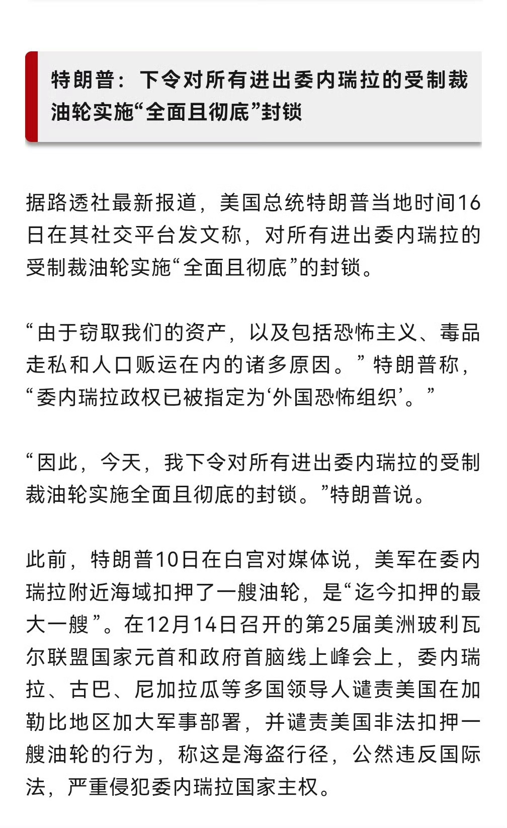 美国总统特朗普16日在社交媒体上称,认定委内瑞拉现政府是“外国恐怖组织”。