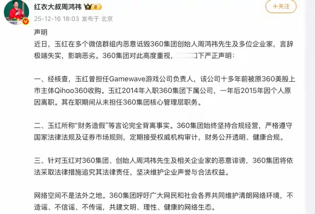 “绑架”“公园约架”“入口封锁”“行业掀桌子”……回顾周鸿祎的商战经历,好像比谍战片还精彩。 最近有消息称“前高管玉红”自爆为360财务造假几十亿。 这次红衣大炮又惹了谁? 仔细一看:我的神啊。 啥高管!最多算个中层。 啥财务造假!指的是运营的游戏账户收入造假。 游戏账户的收入不是随便填的吗? 只要360交税了。 游戏公司的收入想填多少填多少。 最多是投资人会有点小意见。 周鸿祎回应被指财务造假:极端失实 网传前360高管指控周鸿祎财务造假