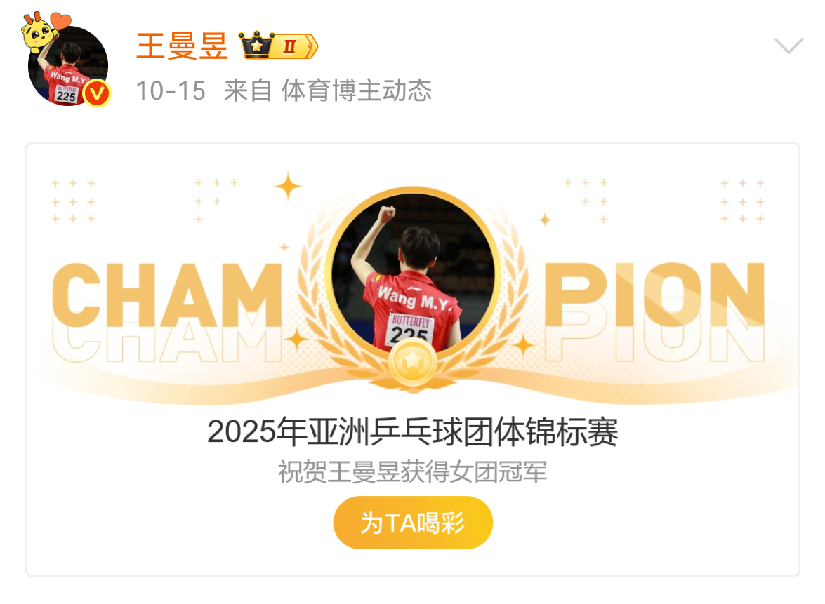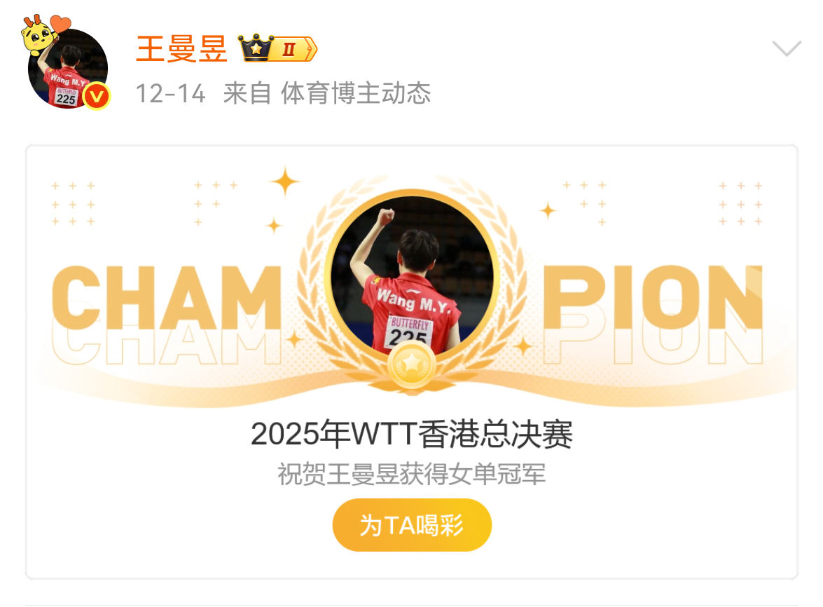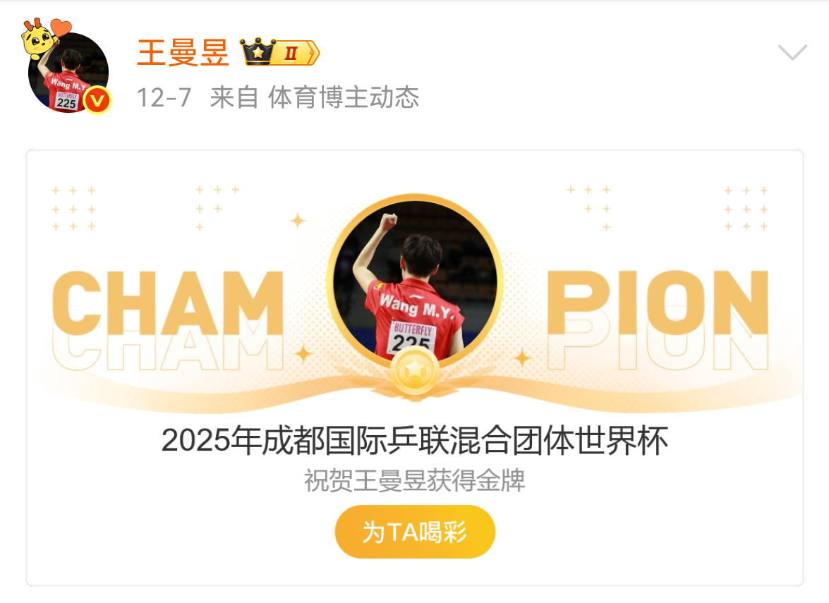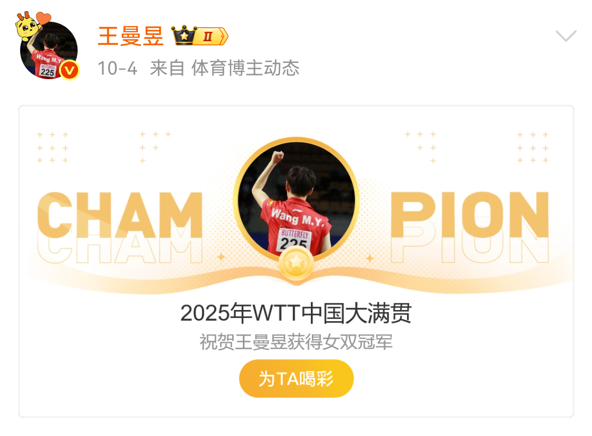 王曼昱本赛季国际赛事9冠加上四年一届的全运会,王曼昱本赛季共夺得10个冠军🥇🥇🥇🥇🥇🥇🥇🥇🥇🥇恭喜王曼昱!2026再接再厉!