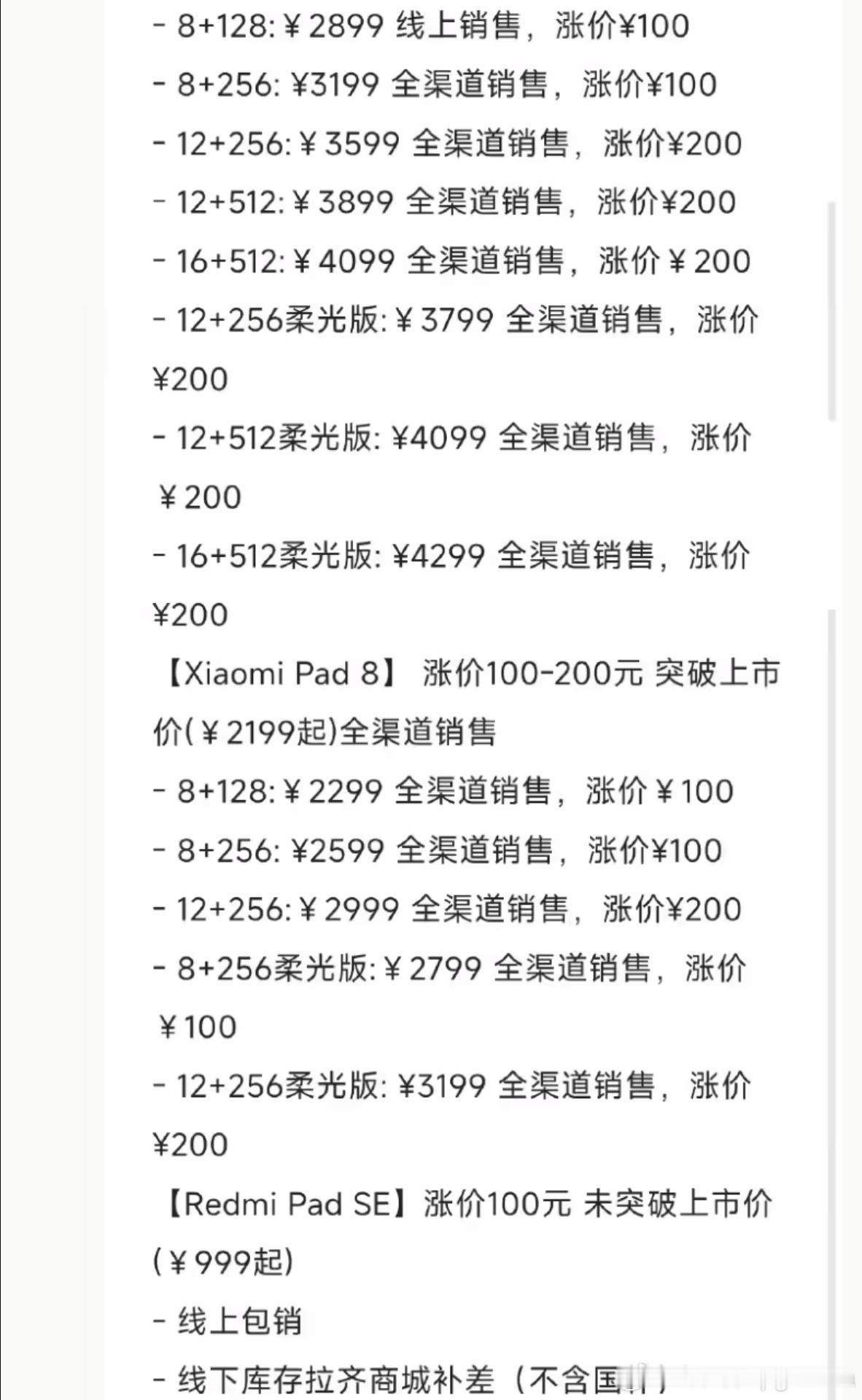 小米之后荣耀宣布平板即将涨价由于近期内存涨价,全球终端产品面临艰巨的成本考验,博主 昨日爆料称,小米部分在售平板已涨价,涨幅 100-300。其它厂商也会有已发售中端机涨价,涨幅差不多也是 100-300,供应链内存涨价影响最大的就是这些中端机,2026 有些中端线新机也要取消 1TB 版本。今日,荣耀终端股份有限公司平板与 IOT 产品领域总经理 表示:“亲爱的小伙伴,内存涨价实在扛不住了,我们涨价也快到了,需要购买平板的建议赶快入手。”荣耀中国区智慧生活业务部部长 则表示“已经开始了”。