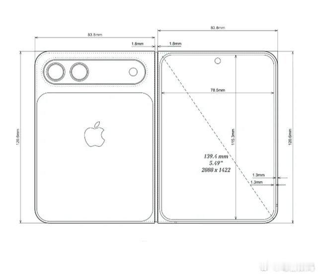 iPhoneFold设计细节曝光现在有爆料称:iPhone Fold折叠屏的外屏约5.3英寸,展开内屏约7.7英寸