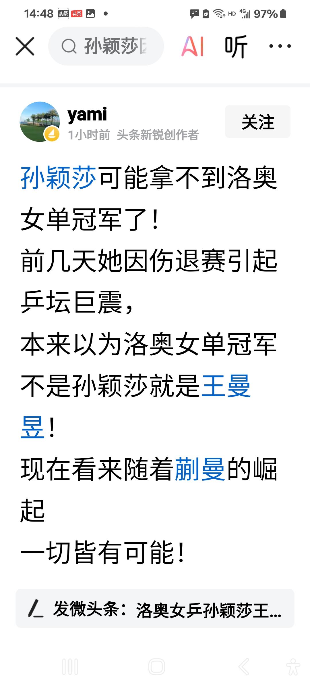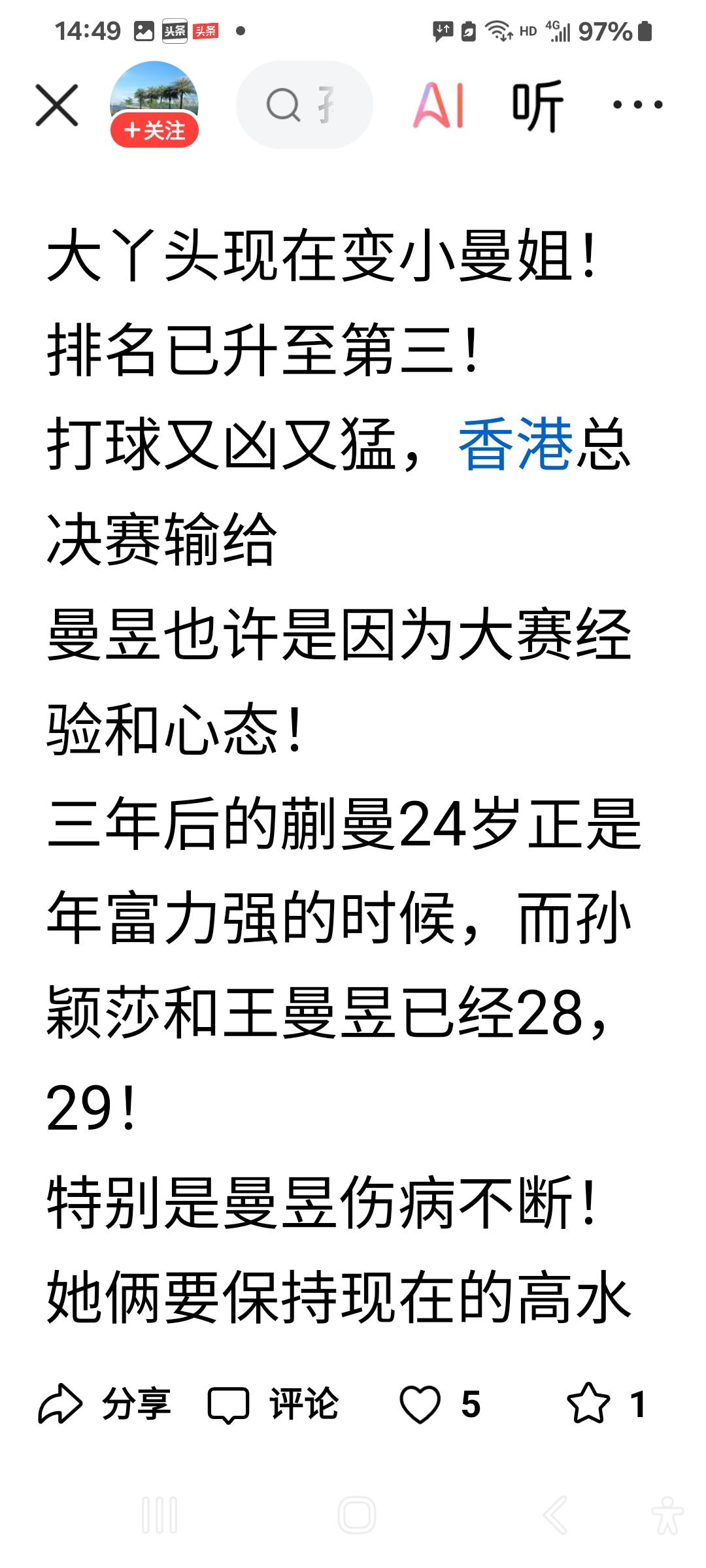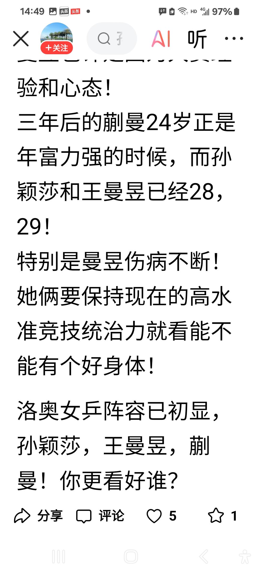 莎莎和曼昱拿不到洛奥会女单冠军的预言为时尚早! 有网友撰文称,洛奥会时,莎莎已经28岁,曼昱已经29岁,年龄已经不占优势了。而大丫头目前风头正劲,涨球十分厉害,而且洛奧会时正值当打之年,所以预测大丫头夺冠的可能性极大。 网友讲得乍一看,很有道理。关键点是,大丫头涨球了,而莎莎和曼昱从现在到洛奥会照样会涨球。至于年龄嘛,也不是什么大事,巴奧会小胖夺冠,已经27岁了,陈梦更是30岁的人了,他们照样夺冠,为什么届时28岁和29岁的莎莎和曼昱就不能夺冠呢?所以,预测莎莎和曼昱洛奧会不大可能夺冠,为时尚早。