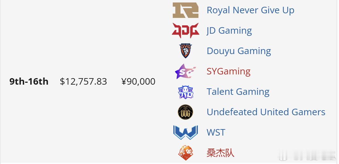 止步单败淘汰赛的八支队伍每支队伍获得9w奖金