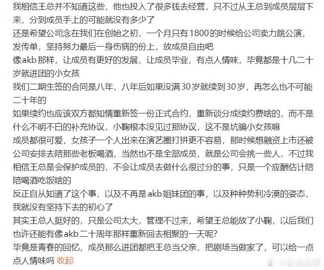 鞠婧祎前队友曾艳芬发声曾艳芬称丝芭曾让成员陪酒 17日,同期生SNH48前成员发文,称鞠婧祎并未见过提及的补充协议,“这不是坑骗小女孩嘛”;透露公司想融资上市时期,成员曾被安排去陪老板喝酒;称解约时自己四年多纳税收入是七十多万,公司主张给了她九十多万,但公司给她接一部戏的片酬是一百万,到手税后拿到九万,说好的总选奖金也没完全发放,最终解约时被要三百万解约费。
