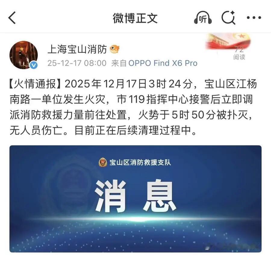 今日火情:凌晨火起,蔓延成灾,历经2小时被扑灭,所幸无人伤亡。事发上海宝山区。今天(12月17日)凌晨3点24分左右,宝山区江杨南路一家冷链物流有限公司突发火灾。从网传视频中可见,火灾现场浓烟滚滚,有类似库房建筑燃起大火。事发后,当地相关部门紧急调派十余辆消防车赶赴现场进行处置。据当地消防部门通报称,火势于5时50分被扑灭,无人员伤亡。事发原因待查。警示:冷链仓储因保温材料多为可燃材质、封闭性强、低温易致消防设施“失灵”等特性,火灾风险隐蔽且蔓延迅速,一旦起火易产生大量有毒烟气,封堵逃生通道。各冷链企业须深刻汲取教训,严守安全底线:严禁使用易燃可燃保温材料,规范电气线路敷设与设备维护;动火作业必须落实审批制度、清理周边可燃物、配备消防器材并专人全程监护;按标准配齐防冻型消防设施,确保疏散通道与消防车道畅通;定期开展安全巡查与应急演练,强化员工安全意识。安全无小事,责任大于天。还请相关企业定期开展消防安全隐患自查自纠,监管部门加强全链条监管,共同筑牢低温环境下的安全防线,切勿心存侥幸!热点 上海宝山区一冷链物流公司凌晨发生火灾