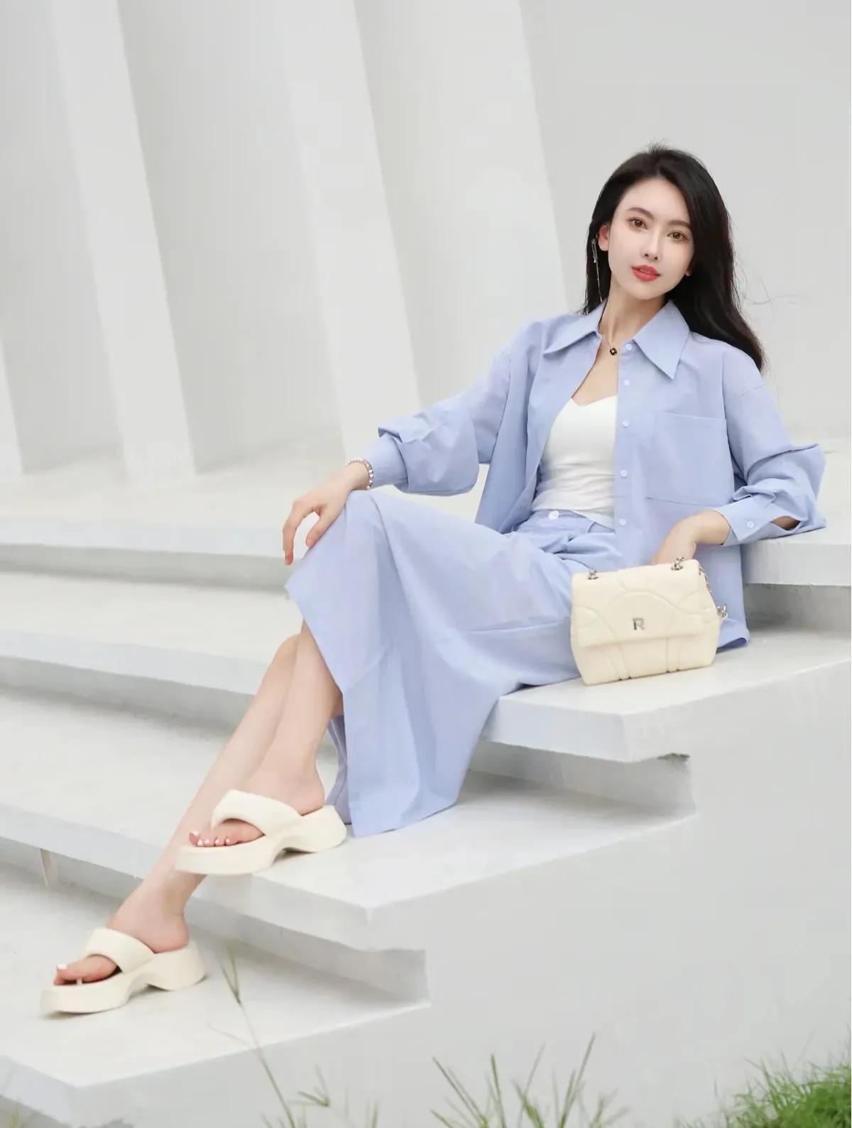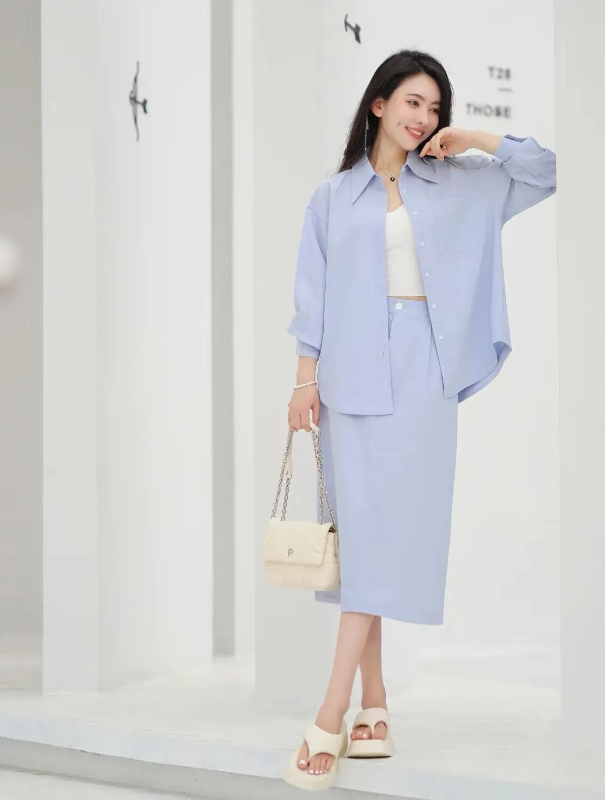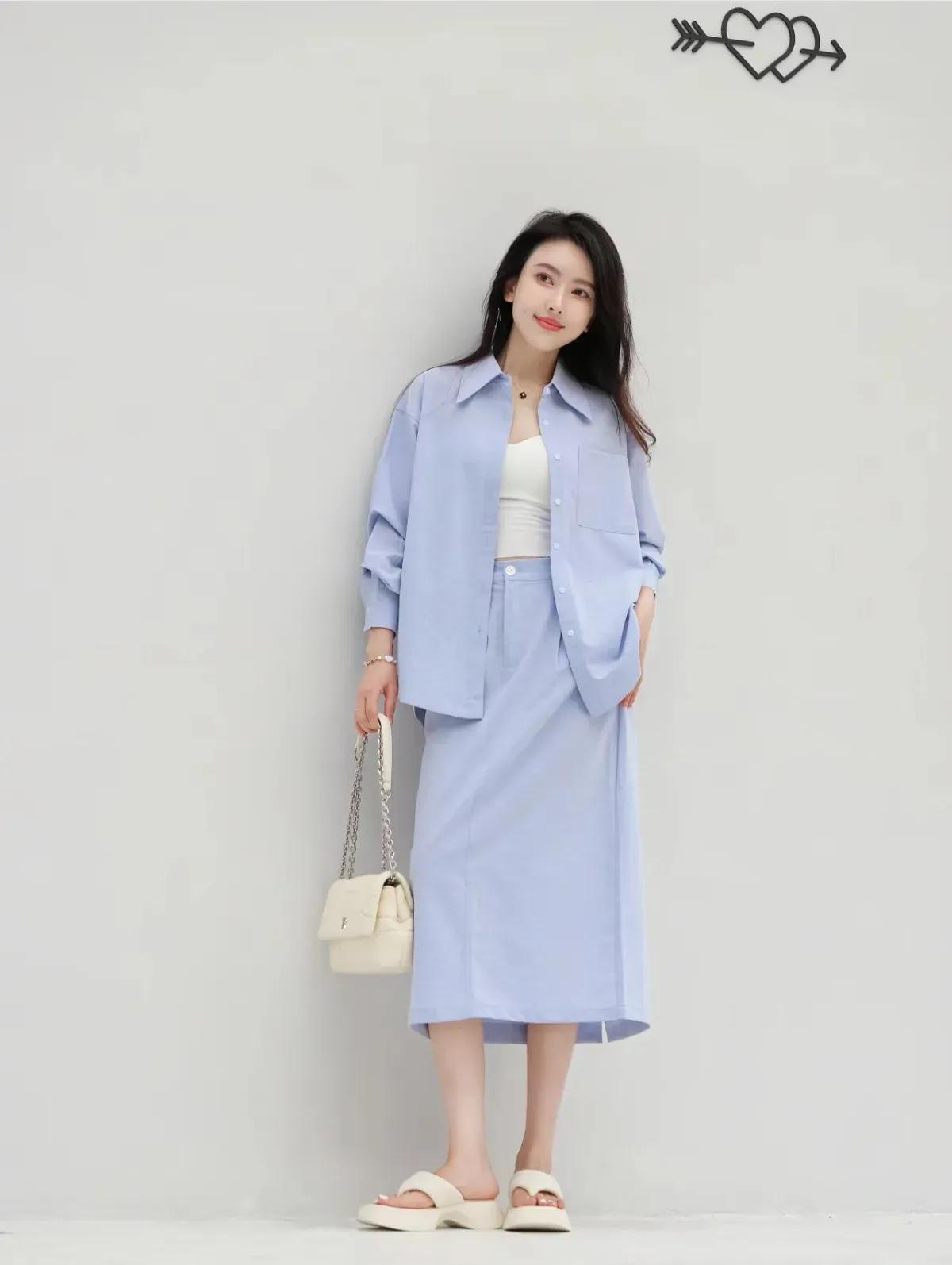 这套穿搭是清新松弛的浅蓝同色系通勤风,温柔舒适又自带简约高级感。浅蓝衬衫+半裙的同色系套装自带清新氛围,宽松衬衫的慵懒版型+收腰半裙的利落设计,平衡了休闲与得体,适配日常通勤或轻社交场合。 内搭白色吊带露出腰线,让宽松造型更显轻盈;米白色包包+厚底拖鞋简约舒适,强化了松弛感,同时与浅蓝调形成柔和呼应。能充分展现穿着者清新松弛的简约魅力。浅蓝色衬衫穿搭