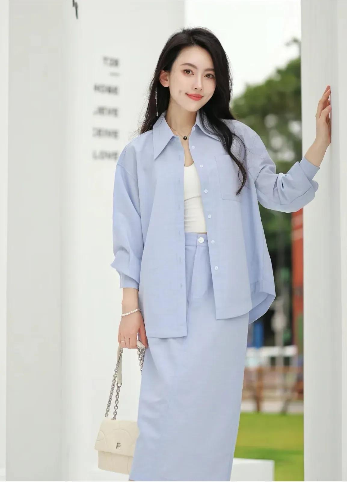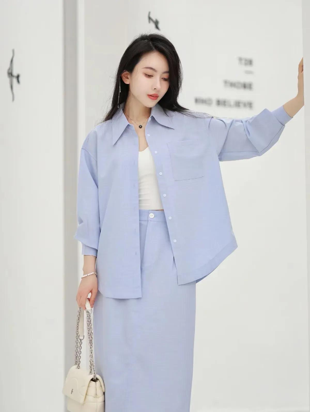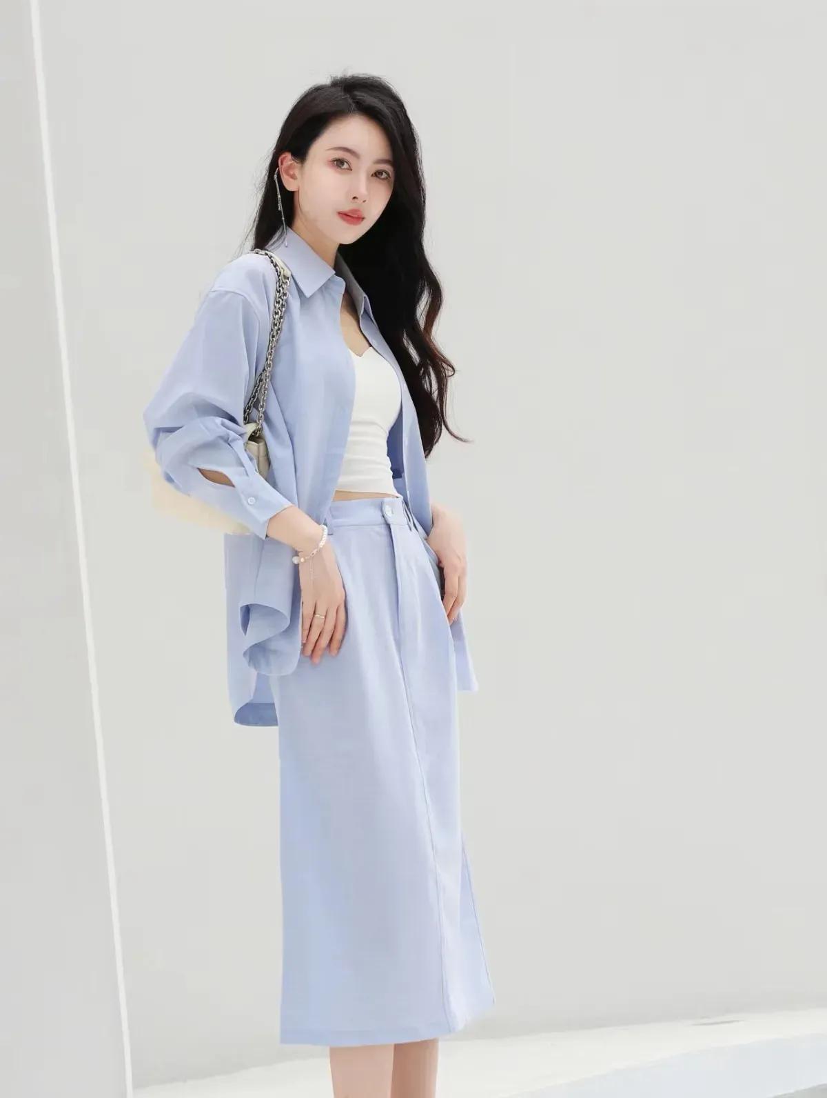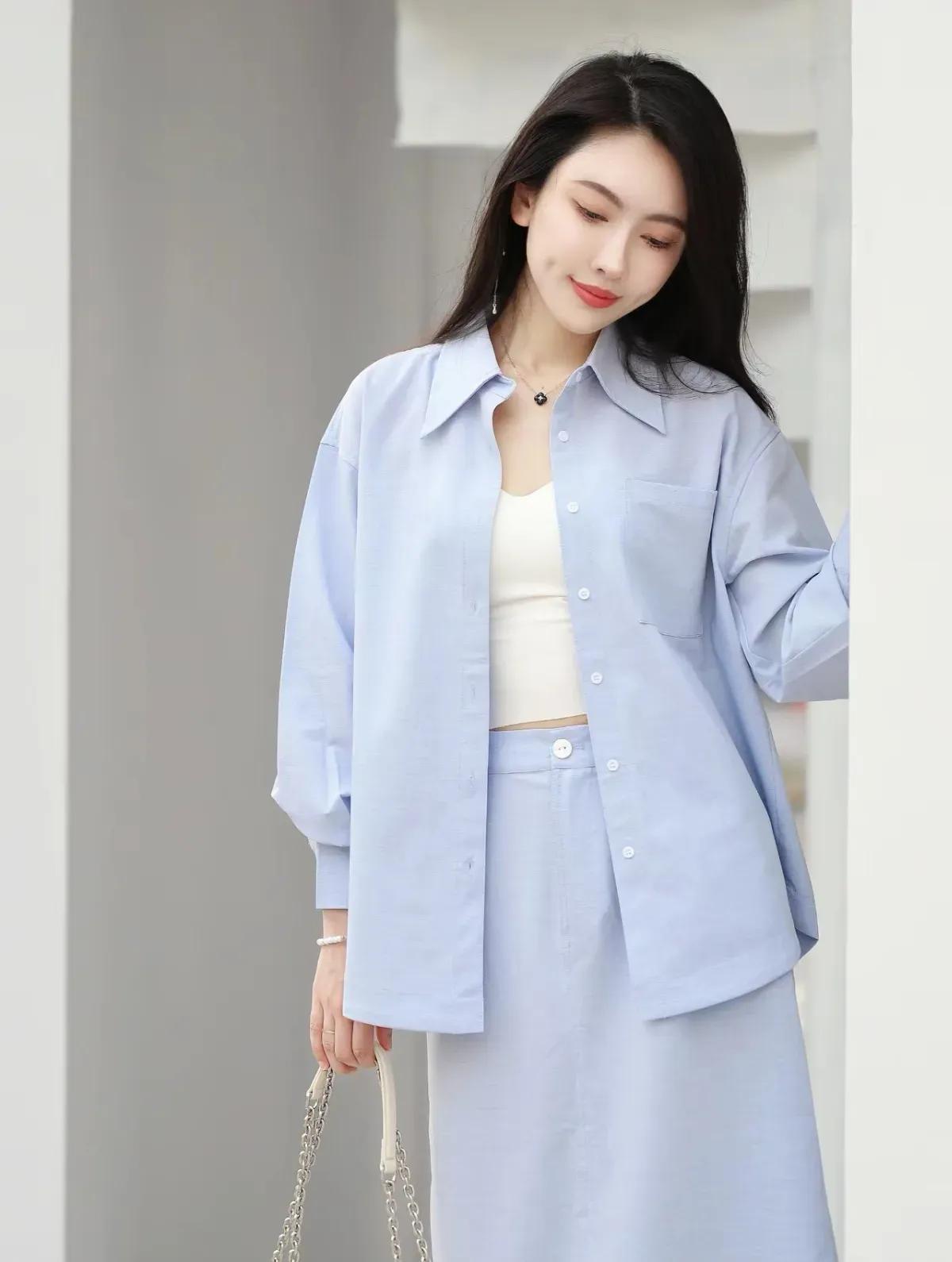 这套穿搭是清新松弛的浅蓝同色系通勤风,温柔舒适又自带简约高级感。浅蓝衬衫+半裙的同色系套装自带清新氛围,宽松衬衫的慵懒版型+收腰半裙的利落设计,平衡了休闲与得体,适配日常通勤或轻社交场合。 内搭白色吊带露出腰线,让宽松造型更显轻盈;米白色包包+厚底拖鞋简约舒适,强化了松弛感,同时与浅蓝调形成柔和呼应。能充分展现穿着者清新松弛的简约魅力。浅蓝色衬衫穿搭