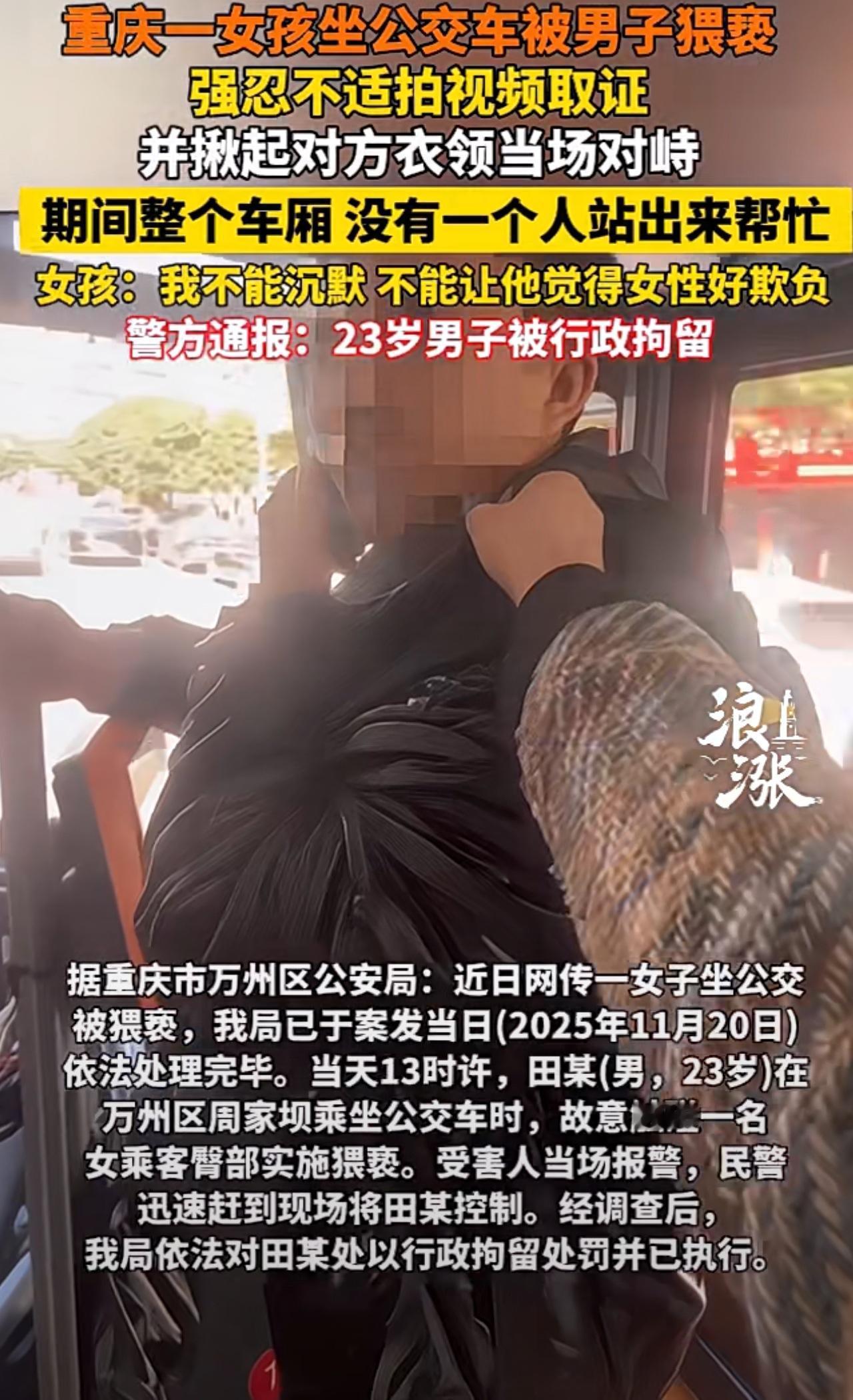 值得推荐,女孩处理咸猪手流程值得借鉴,成功把猥琐男送进去! 重庆一女孩坐公交车被男子猥亵 强忍不适拍视频取证 并揪起对方衣领当场对峙 期间整个车厢一阵沉默,看热闹的居多, 没有一个人站出来帮忙! 最后报警处理为自己争了一口气。 真的很棒,只要有人领头开始反抗,后面的人就知道面对这种情况应该怎么处理了。