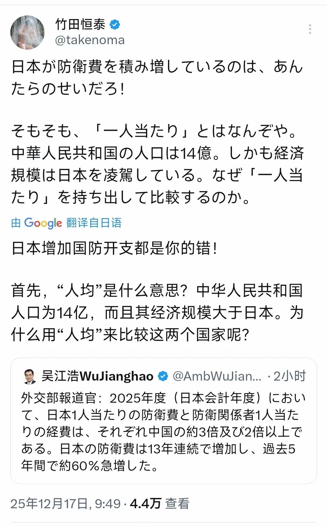 丢人现眼 日明治天皇的玄孙,极右翼作家竹田恒泰发文叫嚣:“日本增加防卫费都是你们的错!说起来,什么是‘人均’呢?中华人民共和国有14亿人口。经济规模也超过日本。为什么要拿‘人均’来比较呢?” 真怀疑这位玄孙小学毕业了吗?吴江浩大使要强调的重点是日本防卫预算13年连增,近5年更是激增60%!就是警告世界,日本企图突破“和平宪法”,重新武装吗! 避重就轻,根本掩盖不了日本的心虚。竹田孙子还是关心一下,日本防务预算虽然增加这么多,但有拿得出手的东西吗?