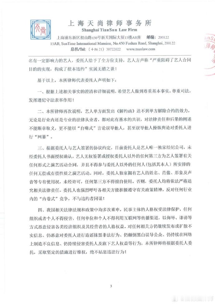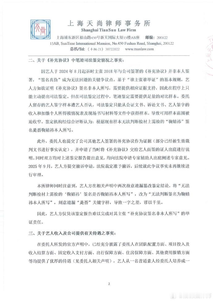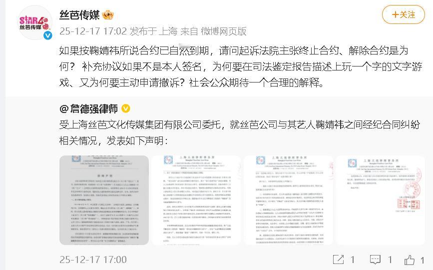 丝芭传媒喊话鞠婧祎丝芭传媒律师声明 17日,方发布律师声明 ,声明中称《补充协议》仅是重新约定经纪代理范围,而不是方声称的“30岁到期终止”;关于“签名真伪”,丝芭方称鞠婧祎方将鉴定结果中的“无法判断是否为鞠婧祎本人所写”中的“是否”删除,导致意义变更;丝芭称给予鞠婧祎全方位支持,鞠婧祎方说的“严重阻碍艺人合体目的的实现”属于无稽之谈。丝芭转发律师声明:“如果按鞠婧祎所说合约已自然到期,请问起诉法院主张终止合约、解除合约是为何? 补充协议如果不是本人签名,为何要在司法鉴定报告描述上玩一个字的文字游戏、又为何要主动申请撤诉?社会公众期待一个合理的解释。”