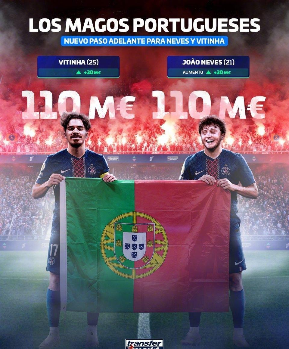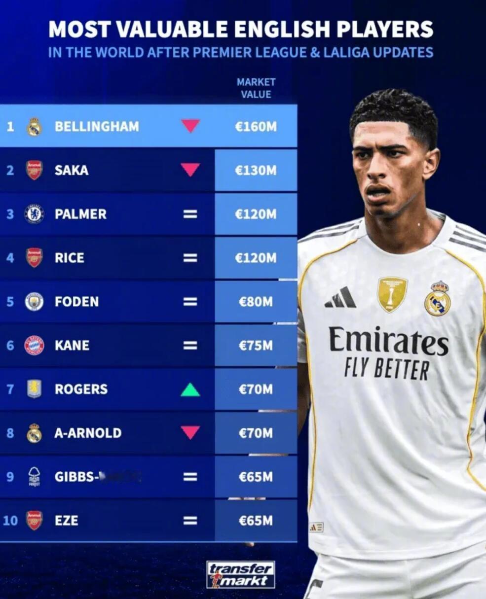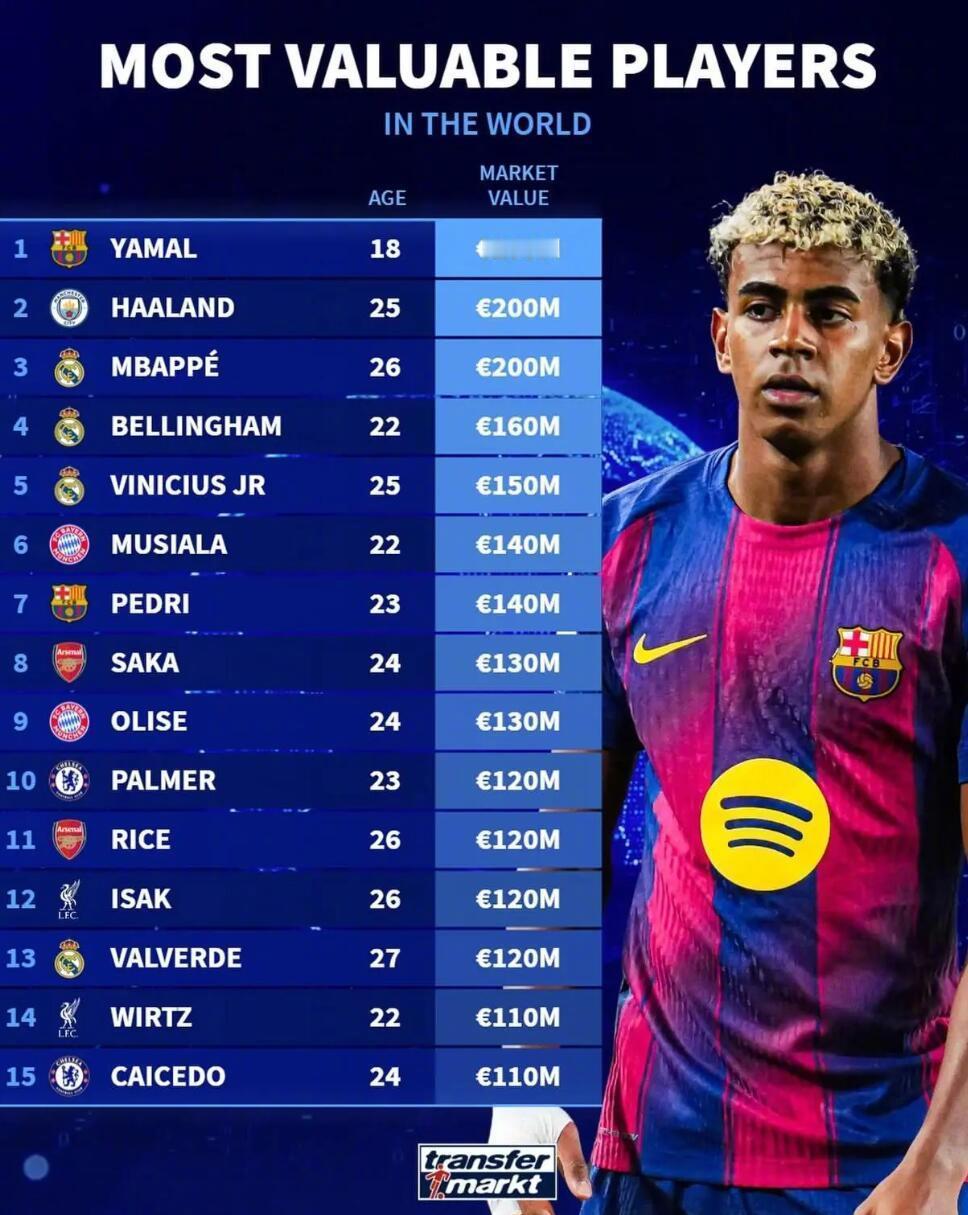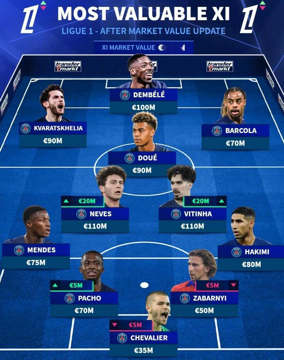 绿茵资讯! ★请爱护“老年人”! 看看本赛季米兰球员在联赛中的出场时间排名,“年迈”的莫德里奇竟然出场时间最多。对于阿莱格里来说,魔笛和拉比奥是球队唯二不可或缺的角色,但也不能这么用吧,能让魔笛多休息一下也是好的,千万避免受伤。 ★还是最差的! 阿莫林执教曼联踢了43场英超,只赢了14场,胜率33%,依然是红魔主教练在英超的最低胜率! ★25岁中场维蒂尼亚和21岁的若昂·内维斯身价同时上涨2000万欧元,一起达到1.1亿欧元,这是葡萄牙球员目前的最高身价。 ★目前法甲身价最高11人首发阵容。 一水儿的都是大巴黎的球员。 ★格林伍德身价上涨1000万欧元,目前身价5000万,追平了曼联巅峰时期的身价,还有继续提升的空间。 ★英格兰球员身价排名! 贝林厄姆虽然身价降了,但还是最贵的英格兰球员。 ★当前足坛身价排名前15的球星! 3个2亿身价的,能达到1亿的球员共有19人。
