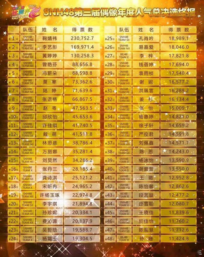 鞠婧祎等7名成员总选票额过亿 谁懂SNH48总选的含金量!35元/票(含3.5元电子票特例),12年榜首累计破亿,鞠婧祎等7人总选票额过亿,人气热度实打实~