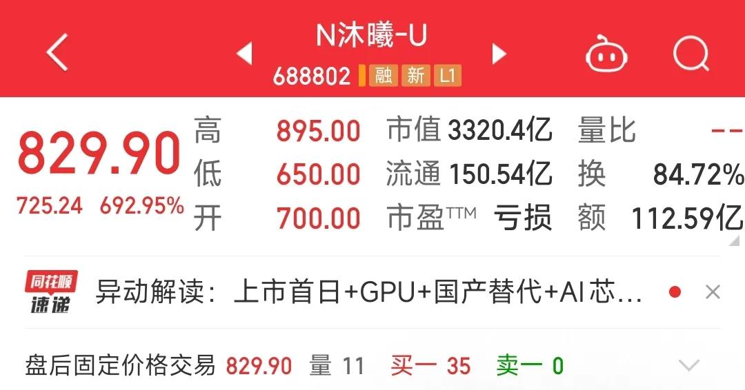 沐曦股份市值3320亿元,今年前三季度实现12.4亿元的营业收入,预计全年营收1