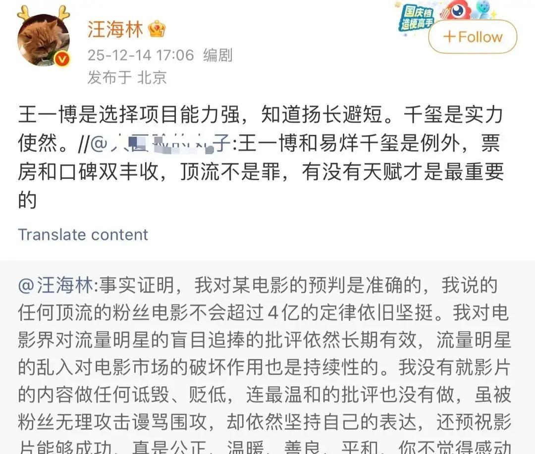 专业影评人骂错人了。 他拎着二十年前的标尺,量九五后演员的戏路。 粉丝撕了三天三夜,没人看见那把尺子早就锈了。 电影家协会刚发的报告,白纸黑字写着:易烊千玺们扎进陕北土窑拍文艺片,王一博们在空军基地一待半年。 他们早就不在流量池里打转,是有些人的评价体系还泡在水里。 问题从来不是“谁更好”。 是你用商业片的票房尺子量文艺片,用老戏骨的深度尺子量二十五岁的脸。 把不同赛道的运动员拽上同一个田径场,然后骂他们姿势不标准。 行业缺的不是好演员,是那把分门别类的好尺子。 给成长留刻度,给时间留标线。 别让下一颗新星,还没升起就先溺死在口水里。