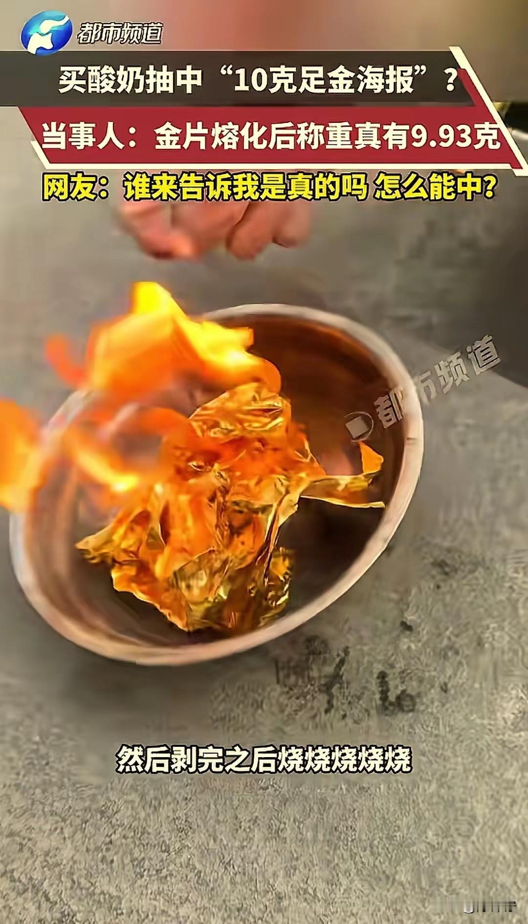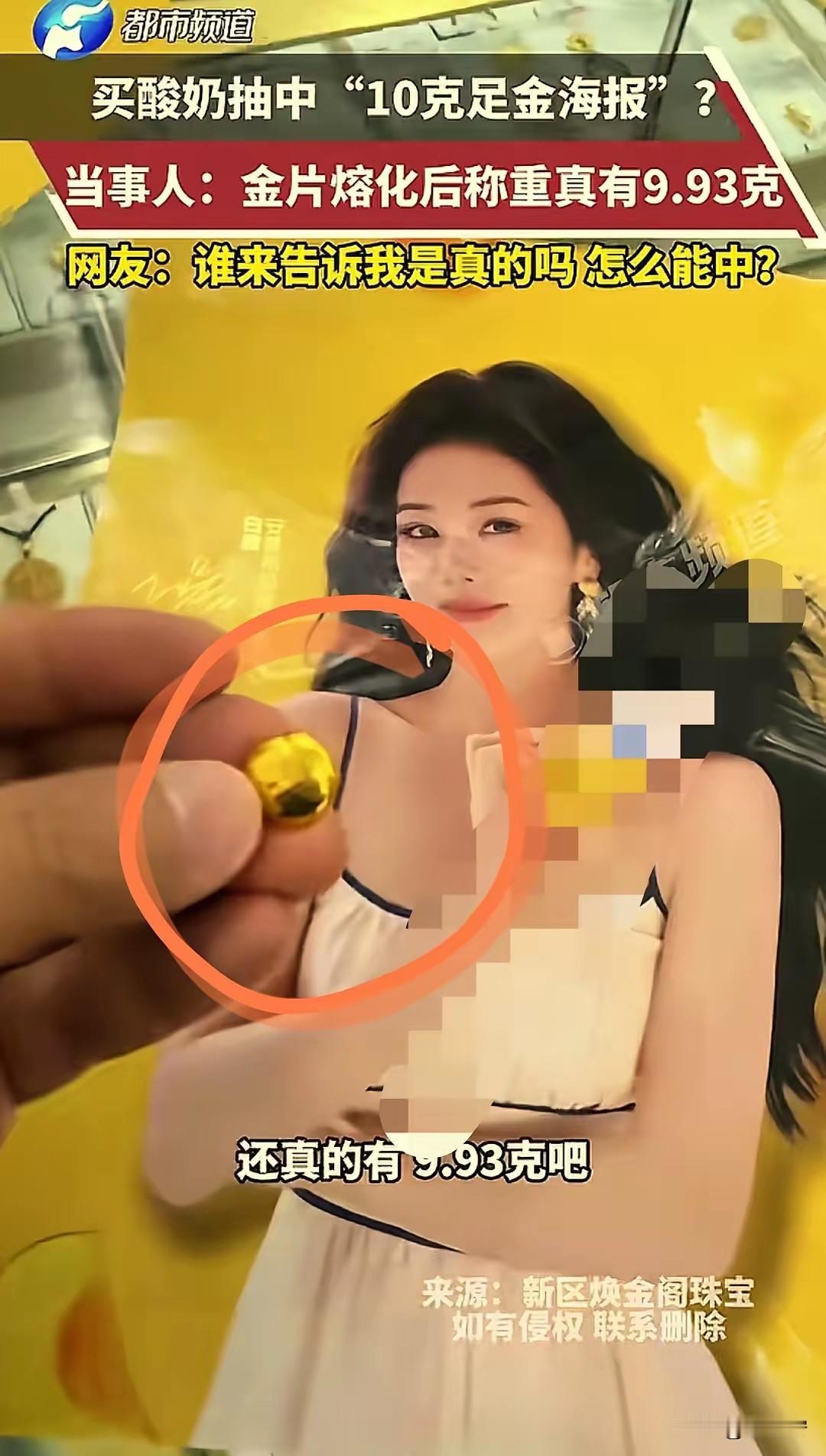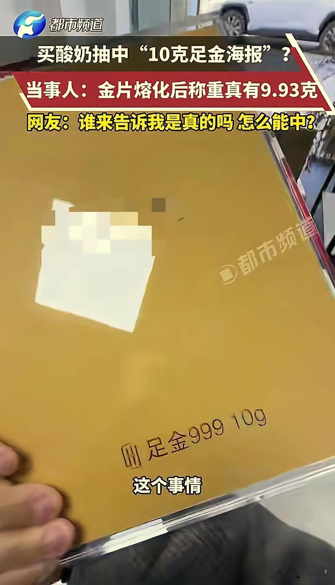 天降横财又秒变“血亏”?江苏一男子喝酸奶抽中10克黄金海报,确认是真金后直接熔成金豆子,称重9.93克,本以为赚翻,结果被网友告知亏麻了! 男子说一开始根本不信,这印着白鹿的海报是黄金做的,检测后才敢动手熔炼,拿到金豆时还乐开了花。 可网友却说,这限量版黄金海报不仅是999足金材质,还带着白鹿的明星效应,在粉丝圈和收藏市场里目前能到5万,以后还会涨,远比10克黄金本身还值钱。 这是捡了芝麻丢了西瓜,估计大哥肠子都悔青了! 黄金冲上热搜 黄金横财 黄金翻车 黄金抽奖 男子 酸奶 黄金