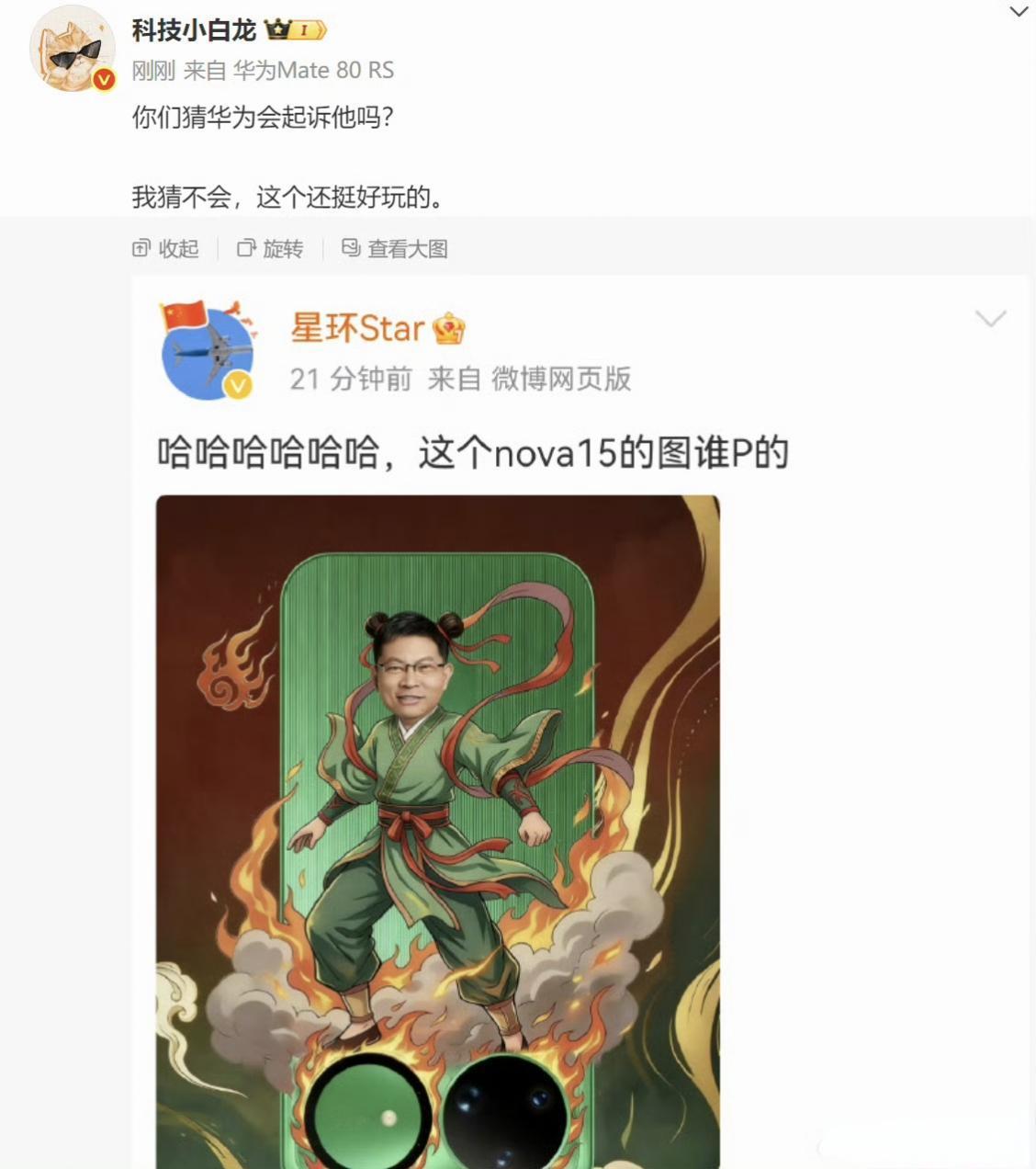 博主“折腾de老猫”发微博说,华为是开得起玩笑的,没有网络玻璃心。他认为网友无恶意的网络玩梗,华为并不介意,华为一直对非诋毁性的趣味创作持包容态度。我一看他转发的内容,差点笑死了,好家伙,余承东居然被人P图成哪吒踩风火轮的造型了,还以华为nova15手机外观制作成了玩梗图片。 那是博主“星环Star”发布的一张余承东哪吒造型的nova15趣味P图,调侃“这个nova15的图谁P的”,图片将余承东的脸融合到哪吒形象中,背景结合nova15的绿色机身与双摄设计,搭配风火轮、火焰等国风元素,让人看了忍不住想笑。 博主“科技小白龙”也转发并发问:“你们猜华为会起诉他吗?”,然后又自问自答说:“我猜不会,这个还挺好玩的”。 我也认为,这类趣味玩梗并非恶意抹黑,华为和余承东是不会追究的。 一直以来,华为针对网络内容的追责主要集中在恶意造谣、抹黑品牌和产品的行为,比如捏造产品问题、诋毁企业高管声誉、传播不实负面信息等,华为会通过起诉、要求道歉等方式维权;但对于这类无恶意的趣味玩梗、创意P图,通常持包容态度,不会进行法律追责。 特别是余承东,更是宽容大度,别说把他P成哪吒了,给他起外号叫余大嘴他都是一笑了之,还久不久的拿来自嘲一下,从不玻璃心。华为