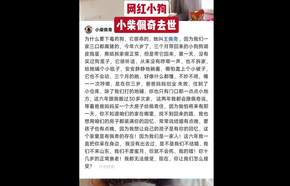 拥有 53.3 万粉的网红柴犬 “佩奇”,随主人迁居山东后遭投毒惨死,死前疼得打滚咬舌。 这只陪伴主人 6 年、历经 30 次搬家的狗狗,曾拍婚纱照,是家人般的存在。 主人蜜月时将其留老家,归来见惨剧深陷自责,事件引发对投毒追责、宠物保护法律空白的热议。 哪来的恶胆毒杀一只狗? 佩奇不吃外人东西,明显是有人蓄意下手,要么是见不得主人走红眼红,要么是对宠物极端排斥,这根本不是 “泄愤”,是没底线的坏! 北京、黑龙江都有投毒杀宠物被判几年的案例,山东这起若毒物危及小孩,凭啥不能重罚? 可现实太憋屈:法律只把宠物当 “财物”,6 年陪伴的感情、近 2000 万点赞的价值,在赔偿里一文不值。 主人就算抓到人,精神损失也讨不回。 更要警惕的是,网红宠物曝光度高,更容易成恶意目标,老家、小区到处是看不见的陷阱。