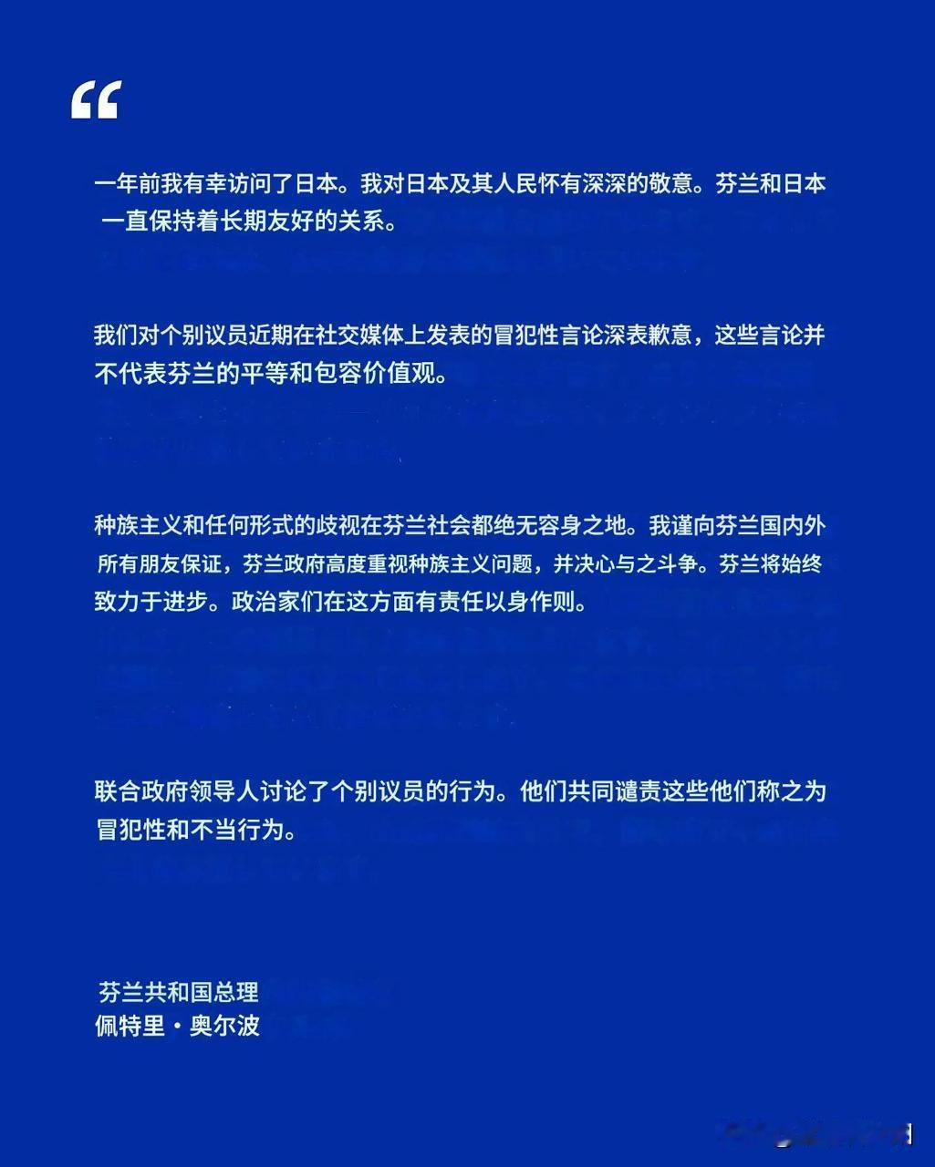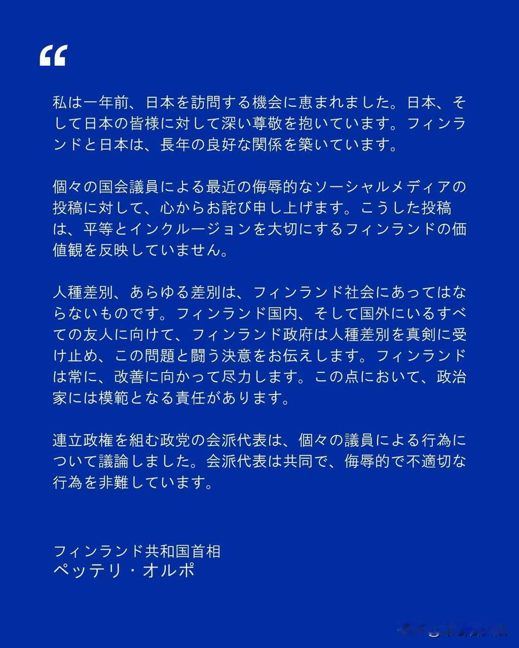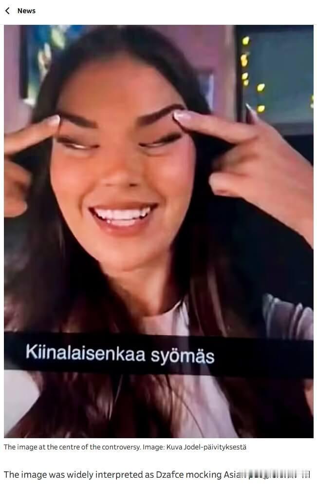 芬兰小姐萨拉·扎夫采拍了张拉眼角模仿亚裔的歧视照片,还配上涉华文字,本想博眼球,结果直接被主办方撤了冠军头衔,成了芬兰选美史上任期最短的“短命冠军”。面对满屏谴责,她非但不认错,反而嘴硬找补,态度傲慢得离谱。 更让人跌破眼镜的是,芬兰议员尤霍·埃罗拉等政客居然跟风站队,照搬她的歧视手势拍照,还发动态喊着“我是萨拉”,硬生生把一场选美丑闻,闹成了政坛的荒唐秀。 芬兰总理奥尔波出来灭火道歉,嘴上说着种族歧视违背芬兰价值观,却上演迷惑操作——只字不提向中国致歉,反倒专门对日本低头。这波厚此薄彼的道歉,属实把双标玩明白了,也难怪网友吵翻了天。 芬兰总理的道歉只提日本却忽略中国,你觉得这是无心之失还是刻意为之?