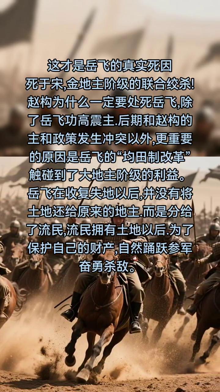 这才是岳飞的真实死因,死于宋,金地主阶级的联合绞杀! 赵构为什么一定要处死岳飞?除了岳飞功高震主,后期和赵构的主和政策发生冲突以外,更重要的原因是岳飞的"均田制改革"触碰到了大地主阶级的利益。 岳飞在收复失地以后,并没有将土地还给原来的地主,而是分给了流民,流民拥有土地以后,为了保护自己的财产,自然踊跃参军,奋勇杀敌。