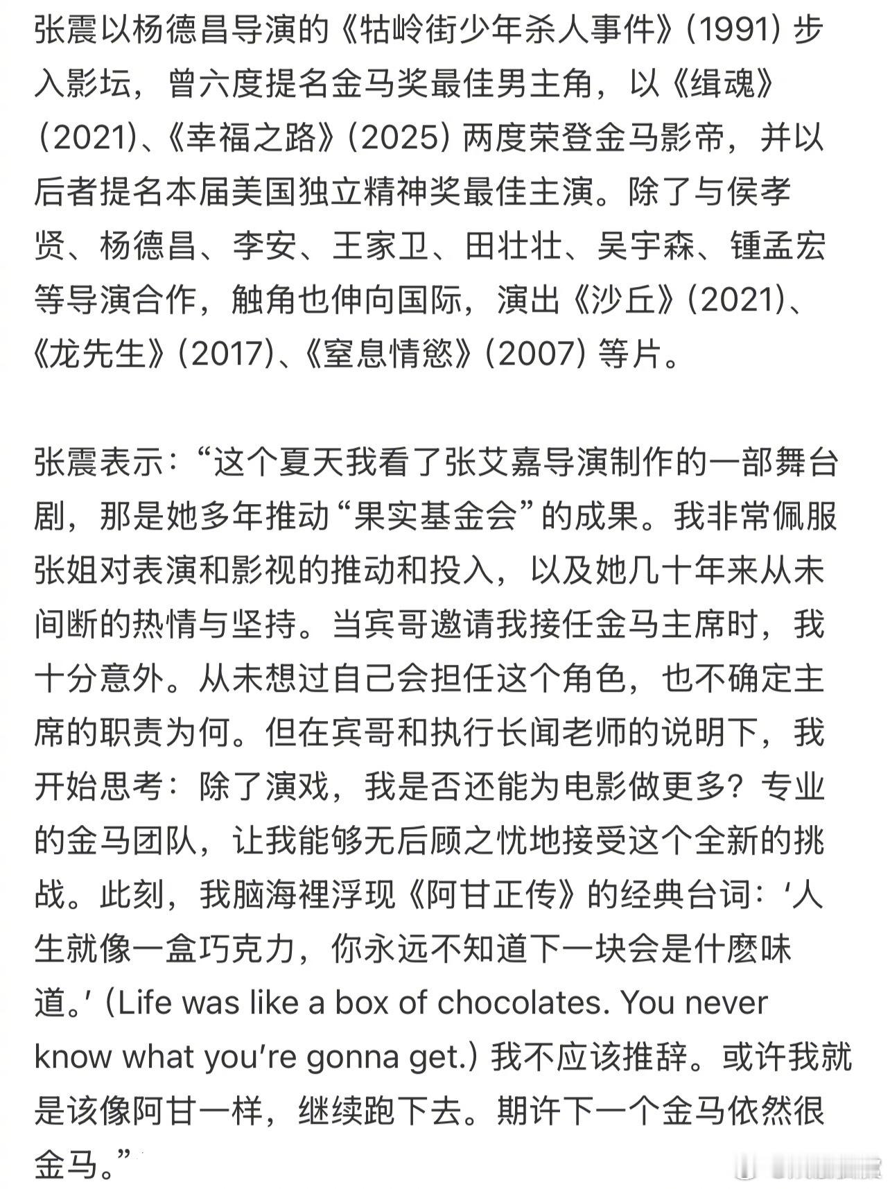 张震接班金马主席 金马执委会宣布两届金马影帝张震接班金马主席,任期四年。张震表示:『人生就像一盒巧克力,你永远不知道下一块会是什么味道。』我不应该推辞。或许我就是该像阿甘一样,继续跑下去。期许下一个金马依然很金马。