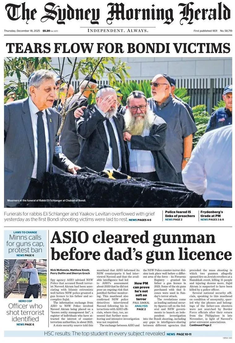 《悉尼先驱晨报》头版报道称,在邦迪地区查巴德犹太教堂为拉比伊莱·施兰格举行葬礼时的哀悼者。 昨天,拉比伊莱·施兰格和雅科夫·列维坦的葬礼上充满了悲痛,因为悉尼邦迪枪击案的首批受害者被安葬。 该报关注了,在悉尼邦迪海滩惨案中行凶者的父亲获得枪支许可证之前,澳新情报局曾为枪手“放行” 。 澳大利亚间谍机构澳新情报局告知新南威尔士州警方,在该州警方为被指控的邦迪恐怖分子纳维德·阿克拉姆的父亲兼同谋萨吉德发放枪支许可证之前,纳维德就一直在与伊斯兰极端分子交往。 本报获悉,澳新情报局已告知其新南威尔士州的对口部门,他们已对纳维德进行了询问,现有情报使澳新情报局在2020年左右评估认为,他不存在持续构成需要进一步监控的风险。 本报还证实,新南威尔士州警方反恐侦探在纳维德与澳新情报局官员接触后对他进行了询问,他们也认为不需要进一步监控和深入调查。 新南威尔士州警方反恐部门的上述行动早在该州警方的另一个部门——枪支登记处——于2023年为他的父亲发放枪支许可证之前就已进行。用该许可证购买的六支枪中的一些被用于周日的恐怖袭击。 此次事件发生在一场大规模枪击案之前,据称两名枪手在光明节活动中向犹太狂欢者开枪,造成15人死亡,数十人受伤。 萨吉德·阿克拉姆疑似被一名警察击毙。 澳新情报局与新南威尔士州警方的信息交流涉及在2021年左右将纳维德·阿克拉姆列入“已知实体管理名单”,这是一份引起反恐当局关注的人员登记册。 几位国家安全官员在匿名的情况下向本报表示,鉴于纳维德此前与极端分子的关联,他们质疑边境部队官员在这对父子枪手11月下旬从菲律宾返回后,为何没有搜查他们的手机和财物。 这些爆料出现之际,主要国家安全人物呼吁联邦政府和新南威尔士州政府对邦迪枪击案展开独立调查,包括情报共享方面的任何漏洞。 一位国家安全消息人士告诉本报 。