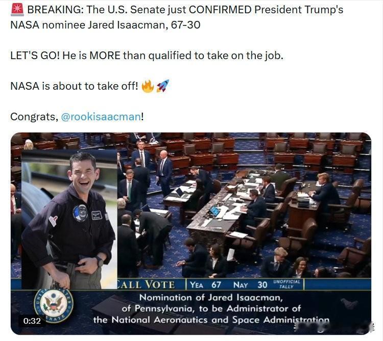 突发消息:美国参议院刚刚以 67 票赞成、30 票反对,确认通过总统川普提名的 NASA 人选 Jared Isaacman。 Isaacman是马斯克推荐的人选,此前马斯克与川普决裂的一个重要原因就是川普撤回了对Isaacman的提名。而在Charlie Kirk被枪杀后,两人重归于好,川普也顺势再次提名Isaacman为NASA负责人。
